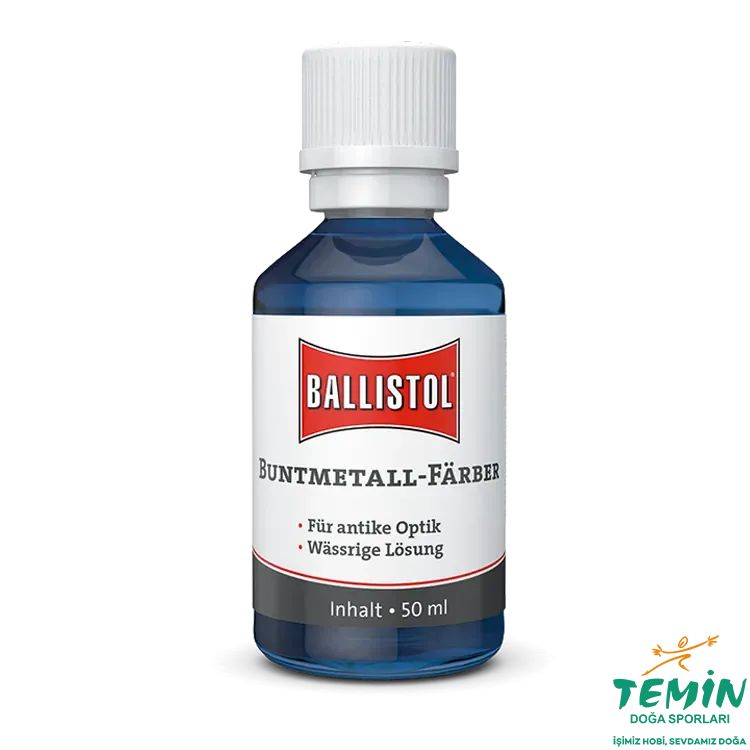 Ballistol Nerofor; bakır, pirinç ve bronz gibi bakır alaşımlarında yüzeye antik görünüm kazandırmak için kullanılan hızlı patina/karartma çözeltisidir. Açık sarı pirinç yüzeyleri koyu kahverengi tonlara taşıyabilir; uygulama süresi uzadıkça ton derinleşir.