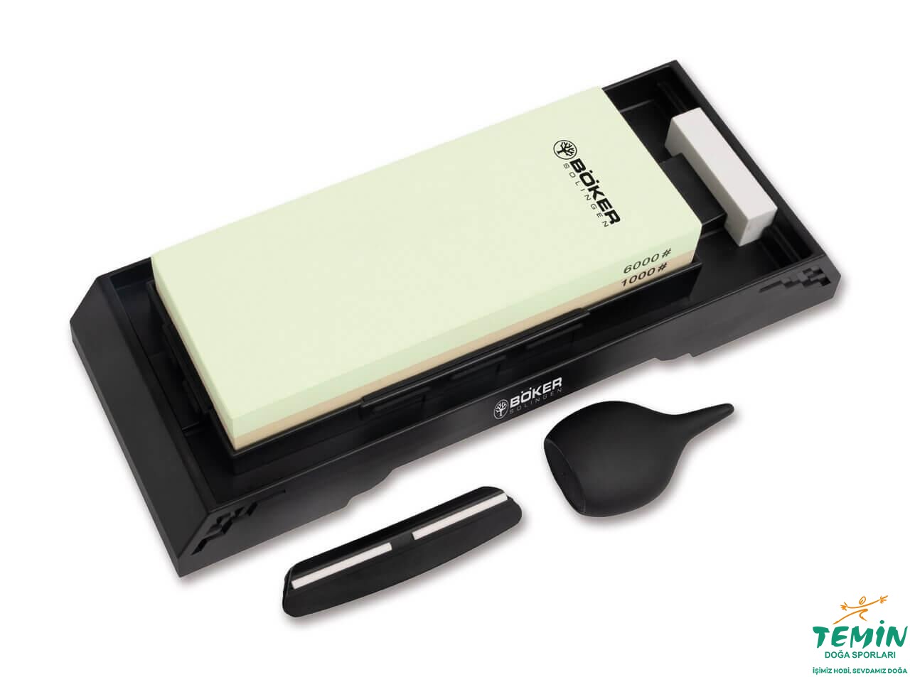 Bu setteki taş, kendi konforundan ziyade bıçaklarının keskinliğine önem veren mükemmeliyetçilerin tercihidir. Taşın (09BO377) 1000 kumluk yüzeyi ile, orta derecede aşınmış keskin kenarları yenileyebilir ve 6000 kumluk daha ince tarafı ile, bıçaklarınızı ileri derecede keskin hâle getirebilirsiniz. Taşlar için sadece en yüksek homojenliğe ve kaliteye sahip yüksek kaliteli korindon kullanılır. Kullanılabilir taşlama yüzeyi 200 mm x 80 mm'dir.