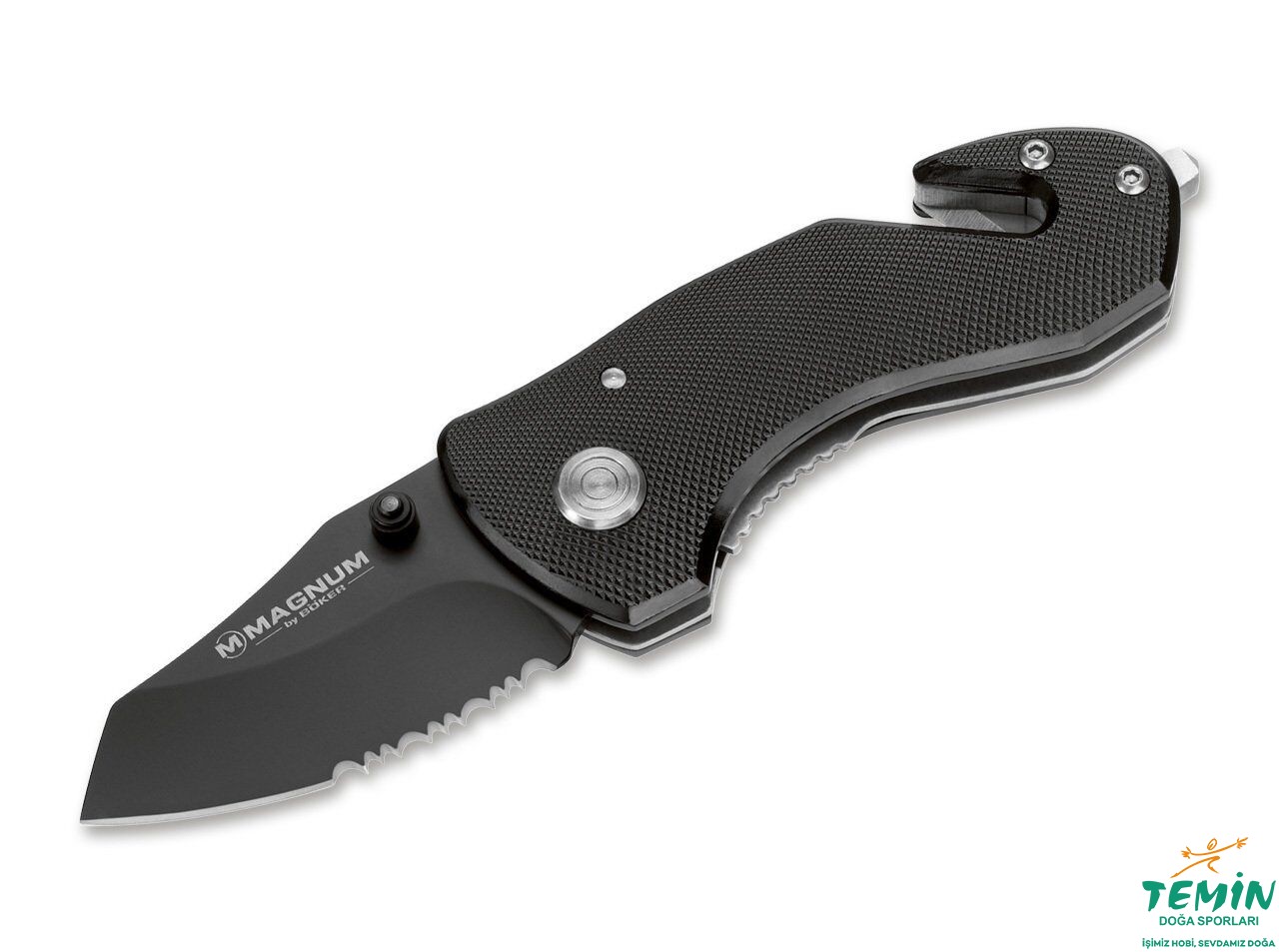 Acil durumda hızlı müdahale için: kemer kesici + cam kırıcı, klipsle taşımaya hazır. Kısmen tırtıklı siyah 440A namlu, liner lock ve çift yönlü thumbstud ile pratik açılış. 53 mm, 85 g.