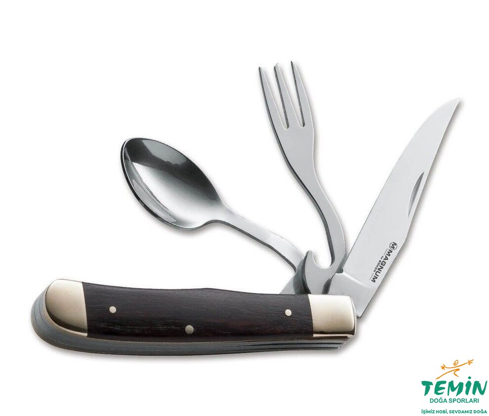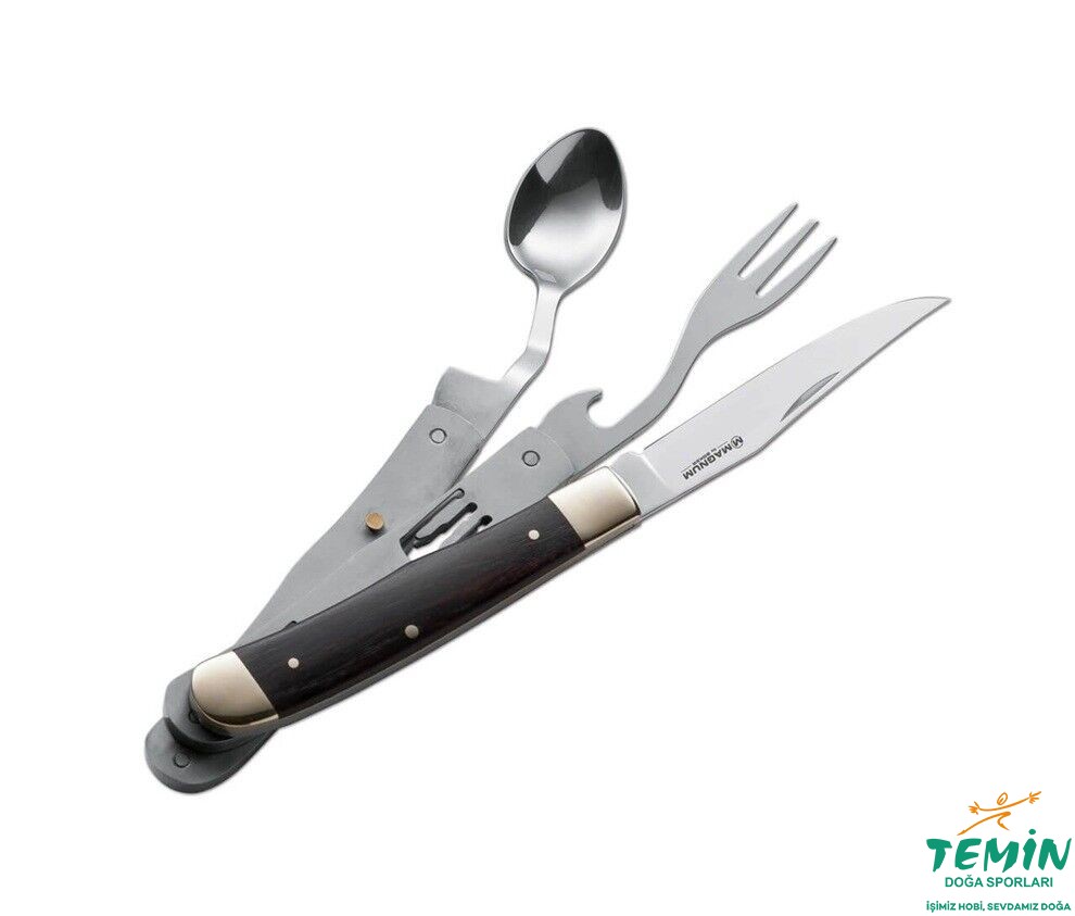 Magnum Bon Appetite kompakt ve kapsamlı bir kamp çatal-bıçak setidir. Bıçak, çatal ve kaşık 440 çelikten yapılmıştır ve yenilikçi kilitleme sistemi sayesinde ayrı ayrı kullanılabilir. Çivi çentiği, çakının kolay açılıp kapanmasını sağlar. Lamine ahşaptan üretilen koyu kahverengi sap pulları ile pirinç renkli desteklerin entegrasyonu, ürünün genel estetik çekiciliğini artırmaya hizmet eder.