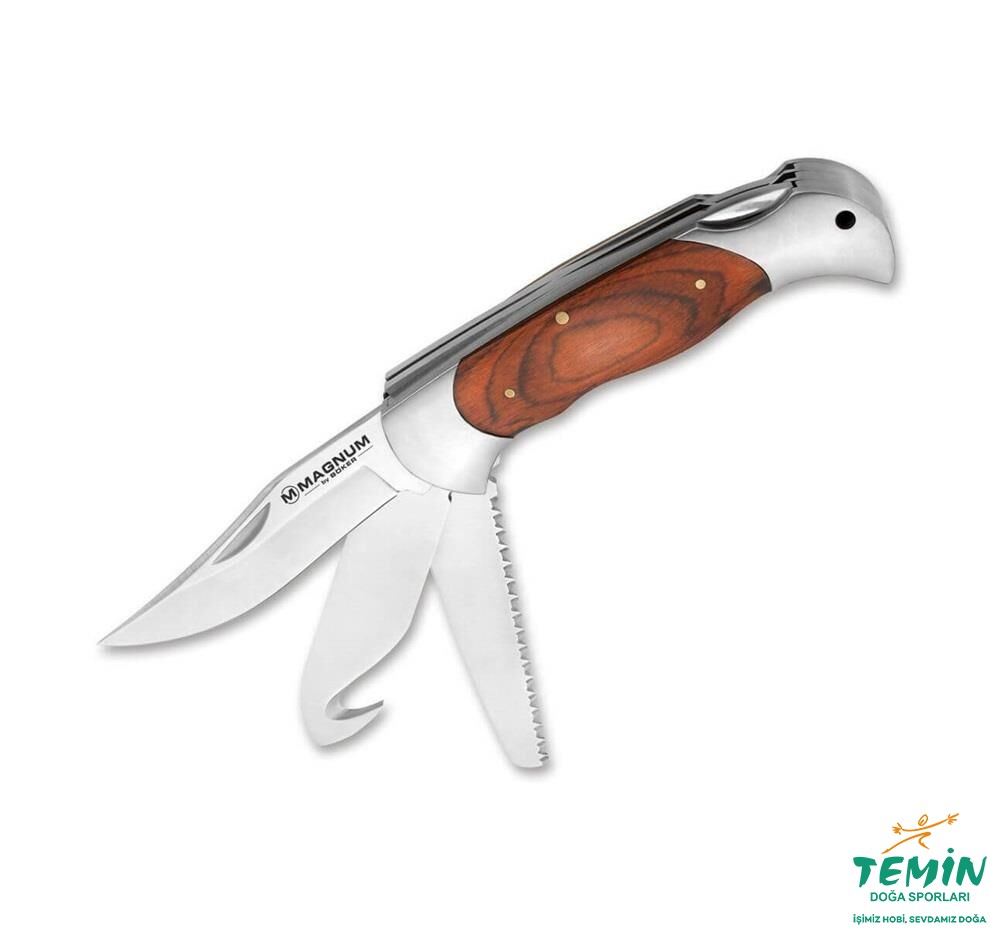 Magnum Classic Hunter, mükemmel bir geleneksel av çakısıdır. 440 paslanmaz çelik ağız çakının istenmeden katlanmasını engelleyen geri kilitleme mekanizması ile kilitlenebilir. Model bir Bowie ağzı, bir yakalama kancası ve bir ağaç/kemik testeresi içerir. Ahşap kabzalar paslanmaz çelik desteklerle güzel bir kontrast oluşturur ve genel görüntüyü tamamlar. Av, trekking veya yürüyüş turu için çok işlevli bir çakıdır.