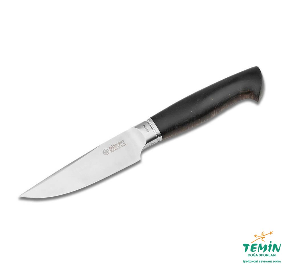 Saten cilalı 440 damla uçlu bıçağın karakteristik özelliği, çekici kabzasının maksimum stabilite için sapa doğru daha geniş bir bıçak sırtıyla birleşmesidir. Buna uygun olarak, belirgin destek klasik av bıçağının siluetini yansıtır. Stabilize kıvırcık akçaağaçtan yapılmış sapı ve kendine özgü kabzası dokunsal bir zevk sunar. Taşlı yol ideal çizgiye dönüşür, ters rüzgar kuyruk rüzgarına dönüşür, Boker Magnum Collection 2024 vitrin ve outdoor macerası arasında mükemmel bir denge kurar. Bu eşsiz parça, yüksek kaliteli, koyu kahverengi deri kılıf ve orijinallik sertifikası ile zarif bir ahşap kutu içinde gelir.