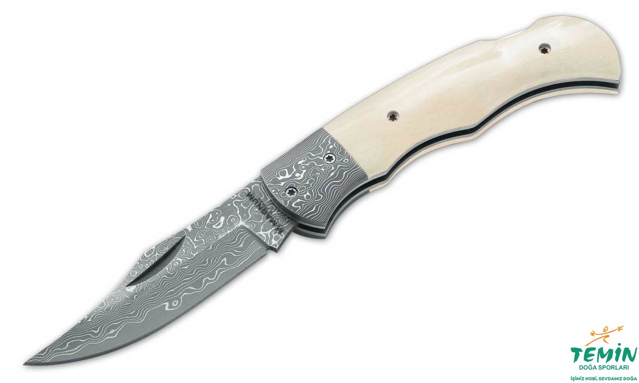 İnce desenli Damascus çeliğin kullanıldığı namlu ve balçağa sahip, sivri uç (clip point) yapısında bir çakı. Bu arkadan kilitli çakının sap malzemesi olarak cilalanmış kemik kullanılmış ve Damascus ile olağanüstü bir kontrast ortaya çıkmış.