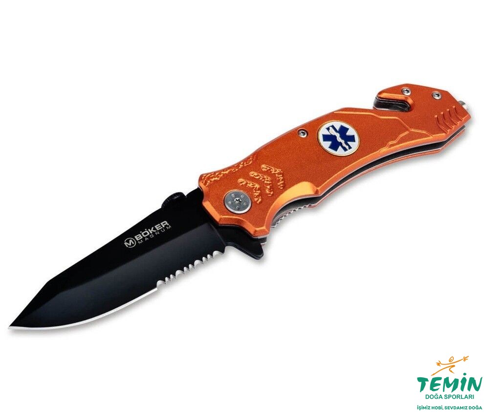 440A malzemeden üretilen siyah kaplamalı ters tanto namlu, kısmen tırtıklı bir kenara sahiptir ve yay destekli flipper ile açılır. Sağlam bir linerlock, bıçak açıldığında kilitlenir. Turuncu eloksallı alüminyum sap, ele her zaman güvenli bir şekilde oturur ve ayrıntılı bir paramedik amblemi bulunur. Cam kırıcı, kemer kesici ve pratik klips (uç aşağı/r) ile birlikte verilir.