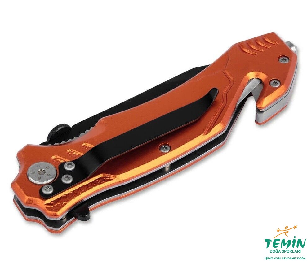 Zor anlarda hızlı erişim: yay destekli flipper ile akıcı açılır, liner lock ile güvenli şekilde kilitlenir. Turuncu eloksallı alüminyum sap sahada daha kolay fark edilir; cam kırıcı ve kemer kesiciyle tamamlanır.