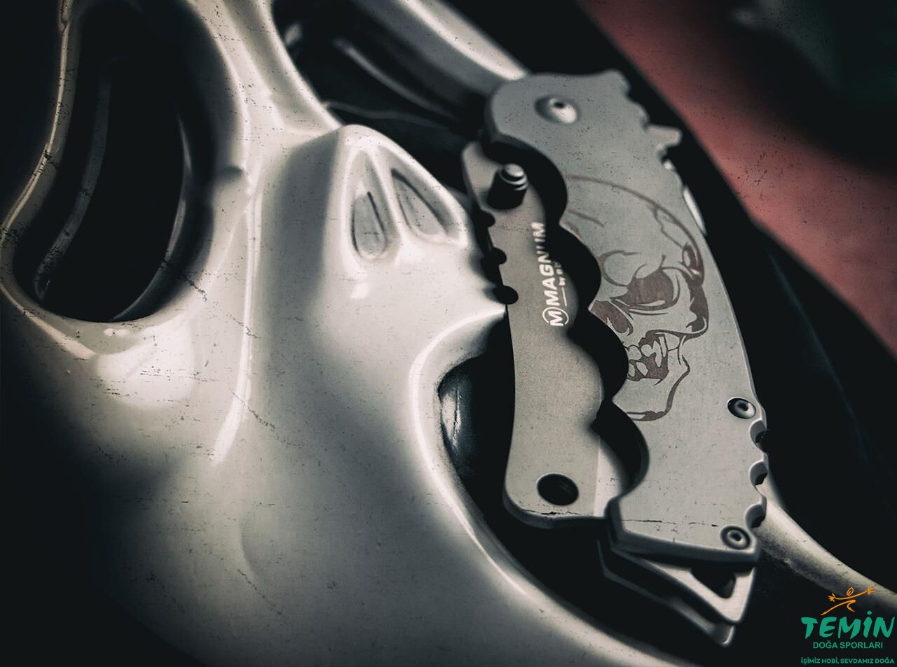 Paslanmaz çelik sap malzemesinin ön yüzü, büyükçe ve yarım bir kafatası çizimi ile (altın renkte) süslenmiştir. Gövdeden kilitli (framelock) çakının parmak oyuklarına sahip olan sapı güvenli kavranmaktadır.
