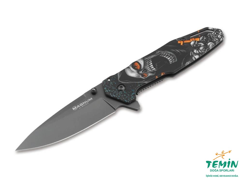 Magnum Screaming Skull, üzerine uygulanan sanat baskısına üç boyutlu bir derinlik kazandıran kabzanın hafif kabartma hatlarıyla büyülüyor. 440A paslanmaz çelikten yapılmış ağız, başparmak mandalı ya da flipper ile açılabilir ve bir gövde kilidi ile güvenilir bir şekilde kilitlenir. Büyük kordon deliği ve pratik derin taşıma klipsi (uç aşağı/r) ile.