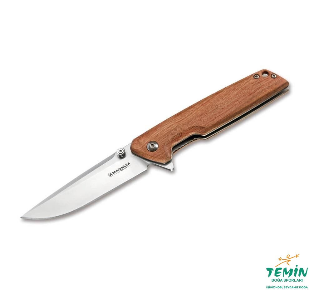 Magnum Slim Brother yalın, sağlam bir tasarım, mükemmel detaylandırma ve özgün özelliklerinin klasik bir bileşimini sunar. Paslanmaz 440A'nın arkaya yakın sivri uçlu ağzı bir ricasso'ya sahiptir ve güvenilir bir linerlock ile sabitlenmiştir. Bir flipper ile ya da dikkatlice döndürülmüş bir sıkıştırılmış thumbstud ile açılabilir. Sap kabzası, zengin bir renge sahip olan ve dokunulduğunda sıcak bir his veren Bubinga ağacından yapılmıştır. Sıkıca monte edilmiş klips (uç yukarı).