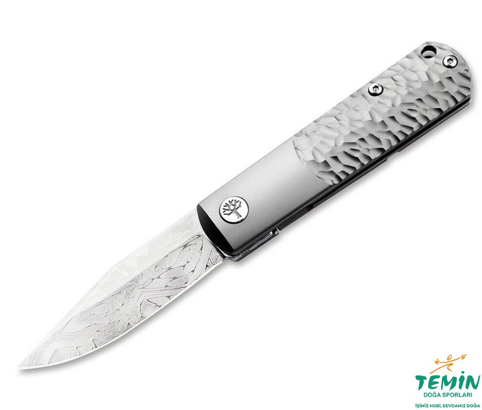 Bıçak açıldığında göze çarpmayan açma tırnağı tamamen ortadan kaybolurken, titanyum cep klipsi (uç yukarı, sağ el kullanımına uygun) güvenli ve şık bir taşıma imkanı sunar. İp deliği ek taşıma seçenekleri sunarken, pivot vidası üzerindeki Böker ağaç amblemi zarif bir son dokunuş katar.