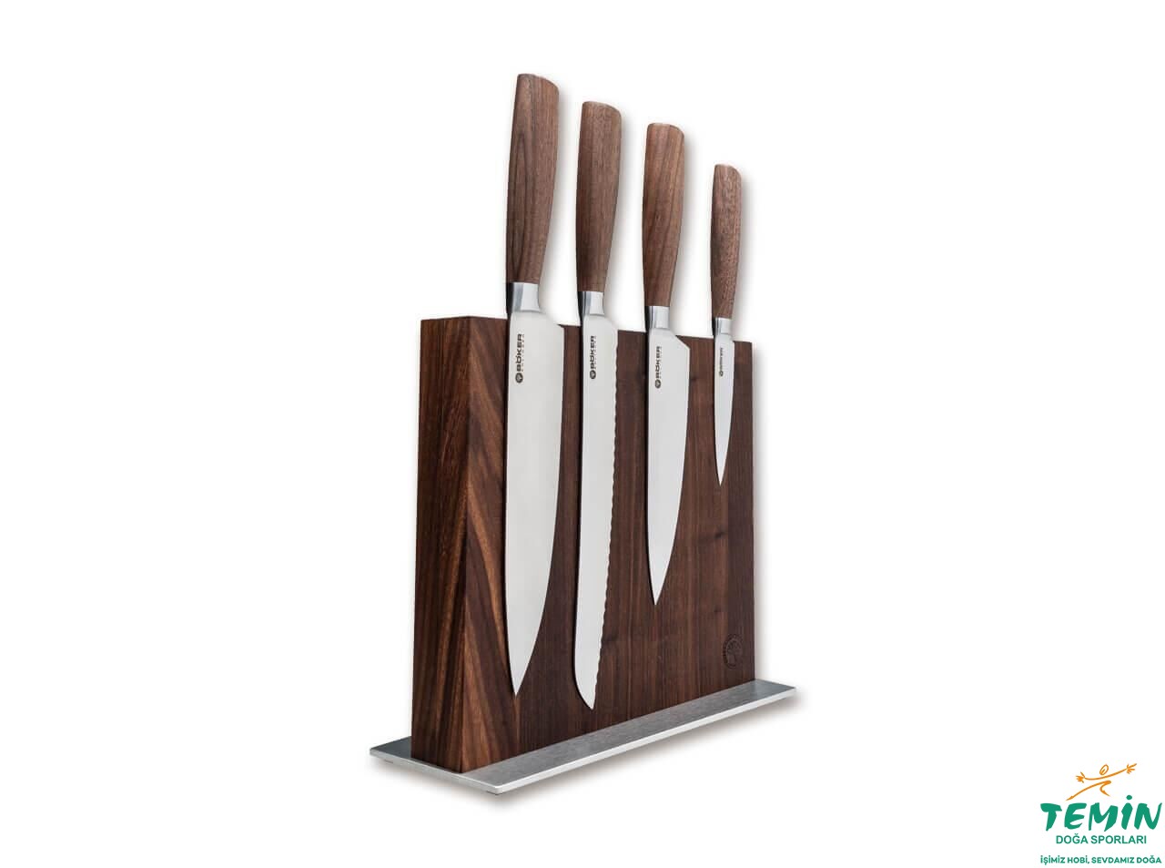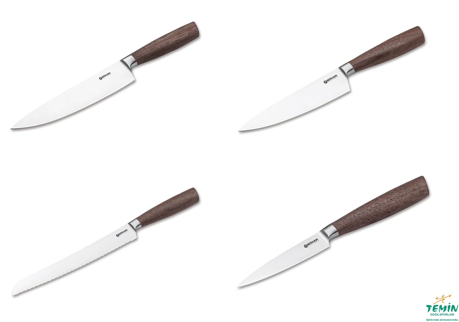 Bu set, stil (style) bıçak bloğundan ve 4 bıçaktan oluşmaktadır. Ceviz ağacından imal edilen masif ahşap bıçak bloğu; kaymaz ve tezgâhınıza zarar vermez lastik ayaklara, ağırlık merkezini aşağı çekmesi ve genişliğiyle kendisini devrilmeden alıkoyan paslanmaz çelik platforma sahiptir. Bıçaklardaki ahşap ve metal uyumunu da tekrar vurgulamaktadır. Manyetik özelliği sayesinde bıçakları kolaylıkla üzerinde tutmaktadır. Eğimli yapısıyla estetik ve farklı bıçak boylarına uygundur. Bloğun her iki tarafı da kullanılabilir. Alt köşesine Böker logosu da itinayla markalanan blok, yerden de tasarruf sağlamaktadır. Seti oluşturan, tam düz (full flat) ağız açımına sahip bıçaklar şunlardır: