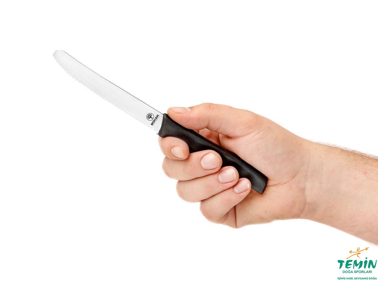 Sandviç bıçağı, keskin tırtıklı-tırtıllı kenarı ile çok yönlüdür. Meyve ve sebzeleri kolaylıkla kesebileceğiniz bu ürün, domates veya ekmek bıçağı olarak da idealdir. Yüksek kalitedeki paslanmaz çeliğin kullanıldığı bıçağın, sentetik sap malzemesi (siyah) bulunmaktadır. Ergonomik olarak şekillendirilen ve pürüzlü bir yüzeye sahip olan sap, daima güvenli bir şekilde ele oturur.