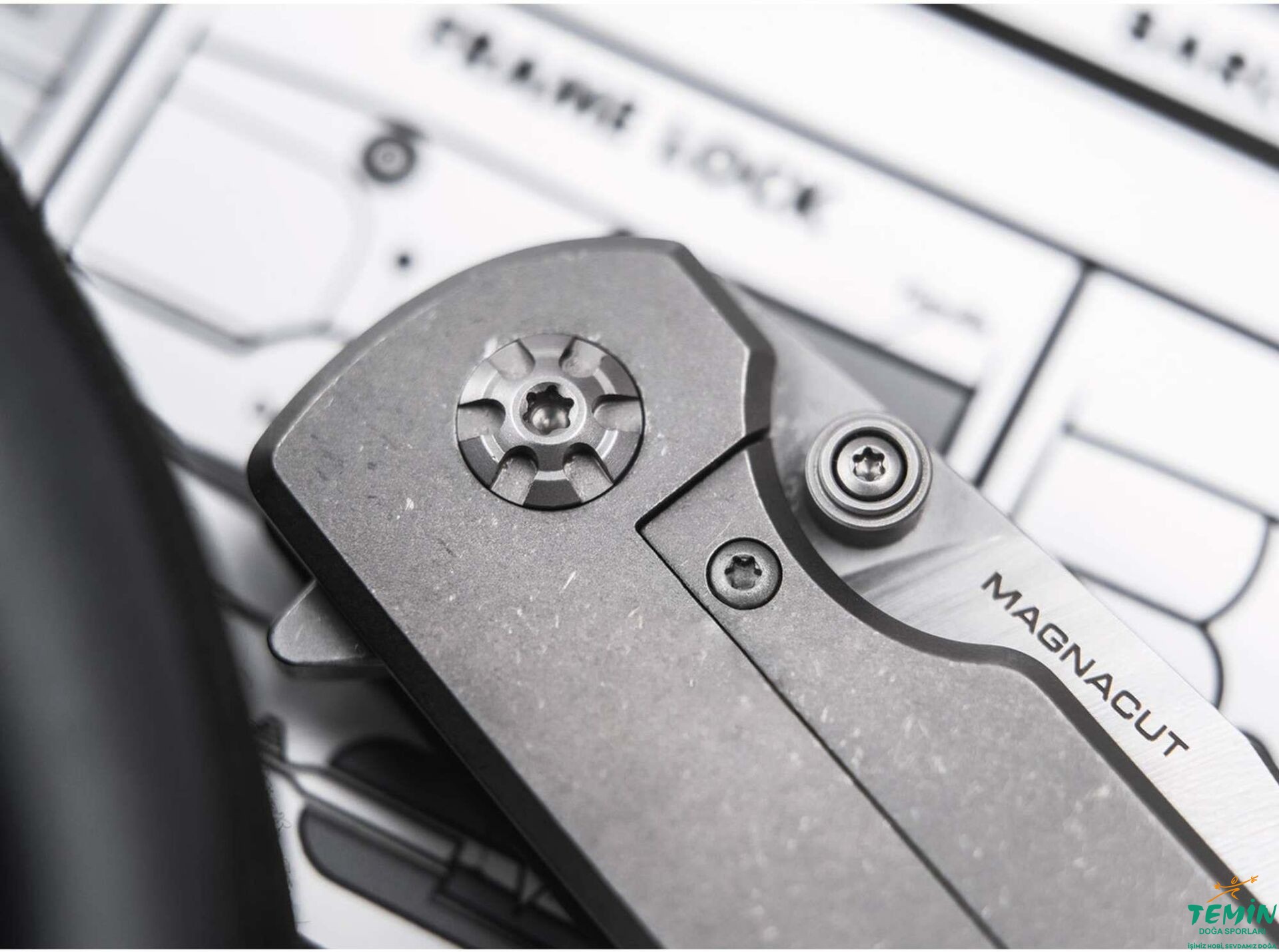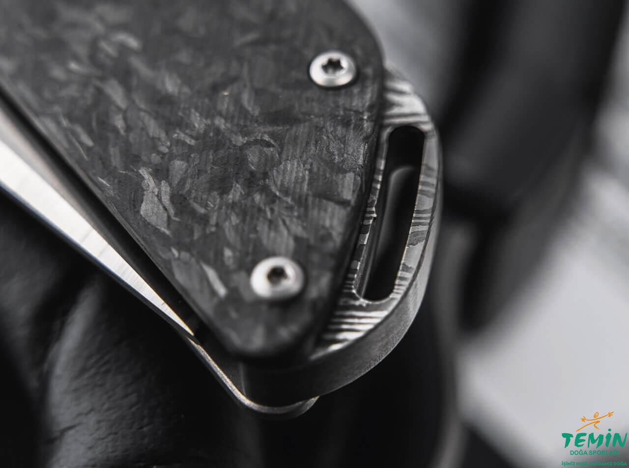 Tam düz ağız açımı (full flat grind) yapılan ve uç kısmın arkası inceltilerek saplanabilme kabiliyeti daha da artırılan sivri uç (clip point) yapısındaki namlunun hareketi, bilyeli rulmanlar kullanılmasıyla, pürüzsüzdür. Kavisli ağız başlangıç çizgisi (grind termination) sayesinde, uzun bir keskin kenarla sağlam bir ricasso harmanlanmıştır. Flipper veya çift yönlü başparmak çıkıntısı (thumb stud) sayesinde istenen elle ve kolaylıkla açılan namlu, gövde kilit (framelock) mekanizmayla sabitlenmektedir. Sapın kilit özelliği gösteren tarafının kaba taşlanmış (stonewash) titanyumdan, ön kanadın ise vahşi desende karbon fiberden imal edilmesi; şıklığı ve sağlamlığı birleştirmektedir. Titanyum kanadın kilit görevindeki kısmının ucuna, dayanıklılığı artıran çelik bir parça eklenmiştir.