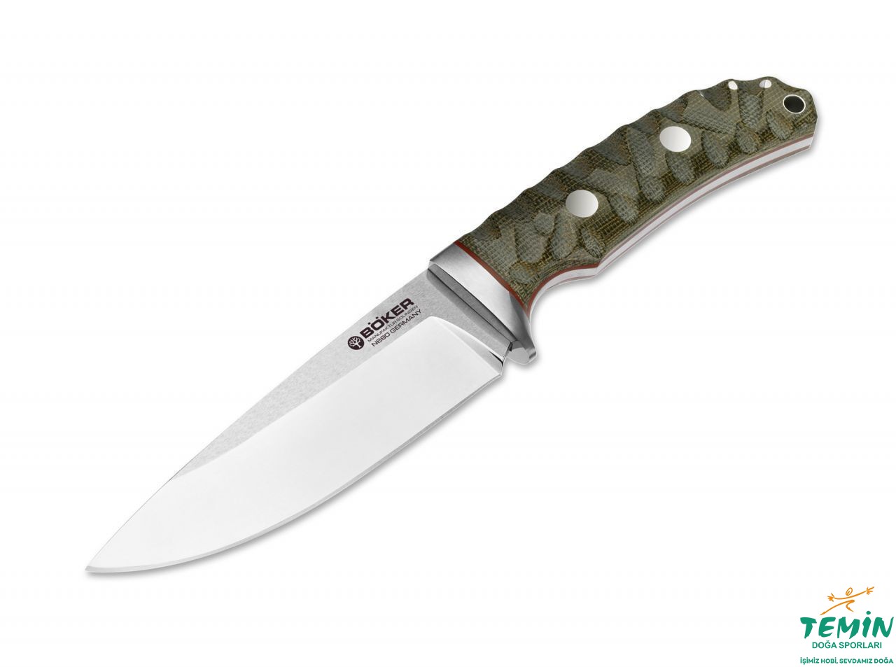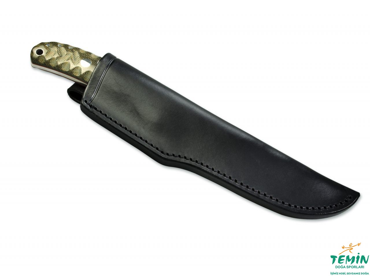 Üzerindeki küçük oyuklarla girintili bir yapı kazanan ve harika bir kavrama yanında mükemmel bir görselliğin kaynağını teşkil eden yeşil renkli mikarta saplar, kırmızı fiber katmanlar (kırmızı fiber liner) üzerine monte edilmiş. Tamamlayıcı bir unsur olarak kordon deliğine (lanyard hole) sahip olan bıçak, yüksek kalitede tulum deri kılıfı ile sunuluyor.