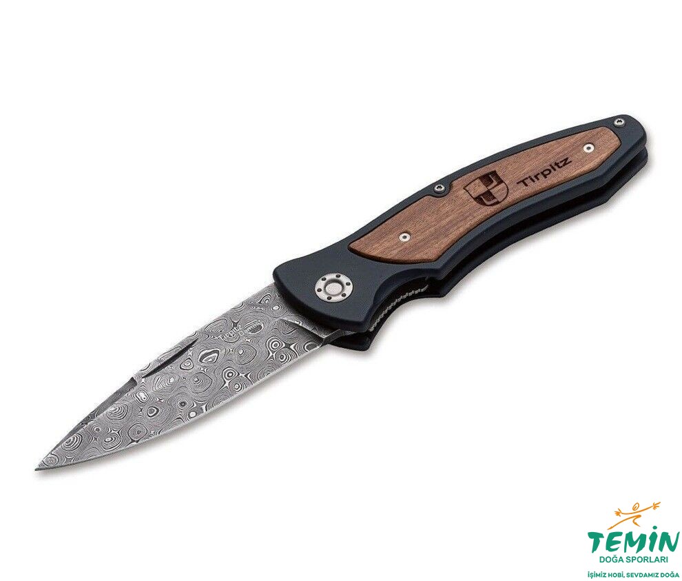 İzlediğiniz versiyonun (Böker Tirpitz-Damascus) alüminyum AlMgSi1 (Bu silisyumlu alüminyum, standart AlMg3'ten çok daha yüksek kalitededir) gövdesi, sert anodize edilerek gri renk almıştır. Gövdenin ön yüzünde, sap konturlarını içeriden takip edecek biçimde (inlay), sap malzemesi kullanılmıştır. Bunun için, Alman uzun namluluları için uzun bir geçmişe sahip olan, yerel ceviz ağacı tercih edilmiştir. Üstün niteliklere sahip ahşabın üzerinde, Tirpitz'in arması gururla yer almaktadır. Yandan kilitli (linerlock) zarif çakının sağlamlığı, kalın bir çelik parçaya (Üzerindeki kavramaya yardımcı sıralı çentiklerle kullanımı kolaylaşmıştır.) görev verilmesiyle perçinlenmiştir. Çakı parçalarının bir araya getirilmesinde cıvatalardan faydalanılmıştır. Sapın görünüşü ve ergonomisi yüksek düzeydedir.