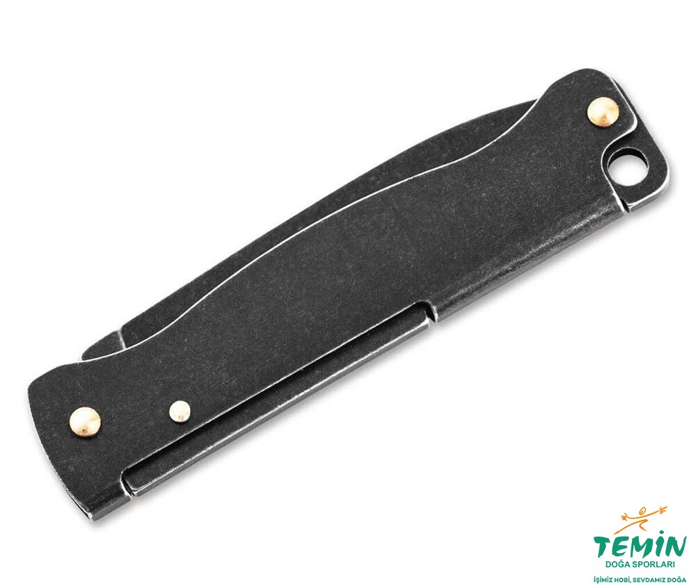 İnce yapısı sağlamdır, bu da onu her durum için ideal bir günlük arkadaş haline getirir. 12C27 çelikten yapılmış drop-point ağızlı çakı, tırnak çentiği ile açılır, kilitlenmez ve günlük küçük kesme işlerini zahmetsizce halleder. Hem ağızlı çakı hem de paslanmaz çelik sapındaki sağlam siyah taş yıkama kaplama, bu küçük çakının işini ciddiye aldığını gösterir.