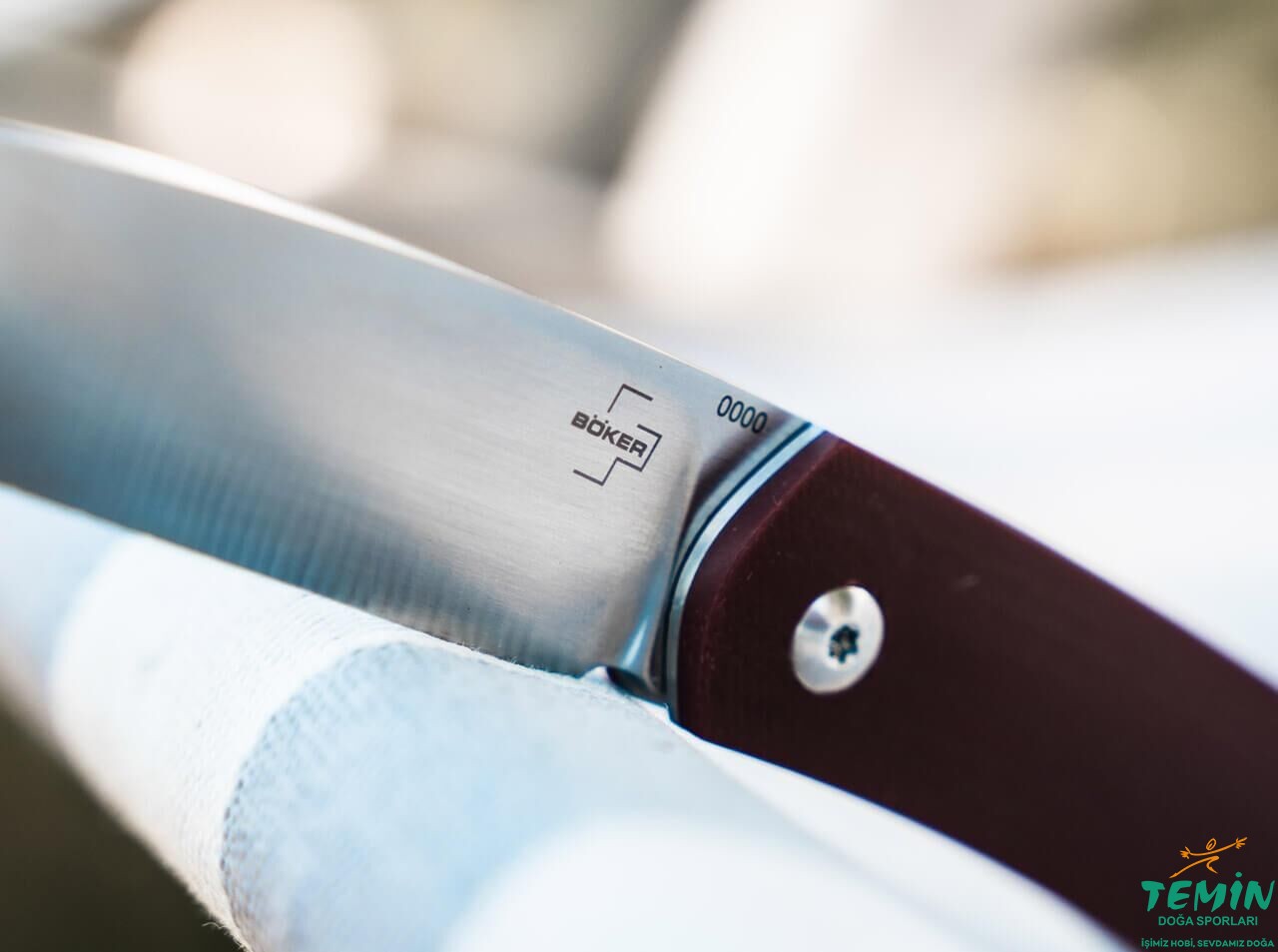Mekanik bir kilidi bulunmayan kayar eklemli (slipjoint) çakının yuvarlak uç (clip point) yapısındaki namlusu, yüksek mukavemetli D2 çelikten imal edilmiştir. Güvenlik için 90 derece açıda durağı bulunan ve yüksek düz ağız açımı (high flat grind) uygulanmasıyla hem dayanıklı hem de çok yönlü kılınan namlu; Böker’in ‘‘hairline finish’’ dediği ve saç teli inceliğinde çizgiler (enine) taşıyan bir parlaklıktadır. Keskin kenarın altındaki minik çentik (choil), kesmeye saplayarak başlamaya hizmet etmektedir.