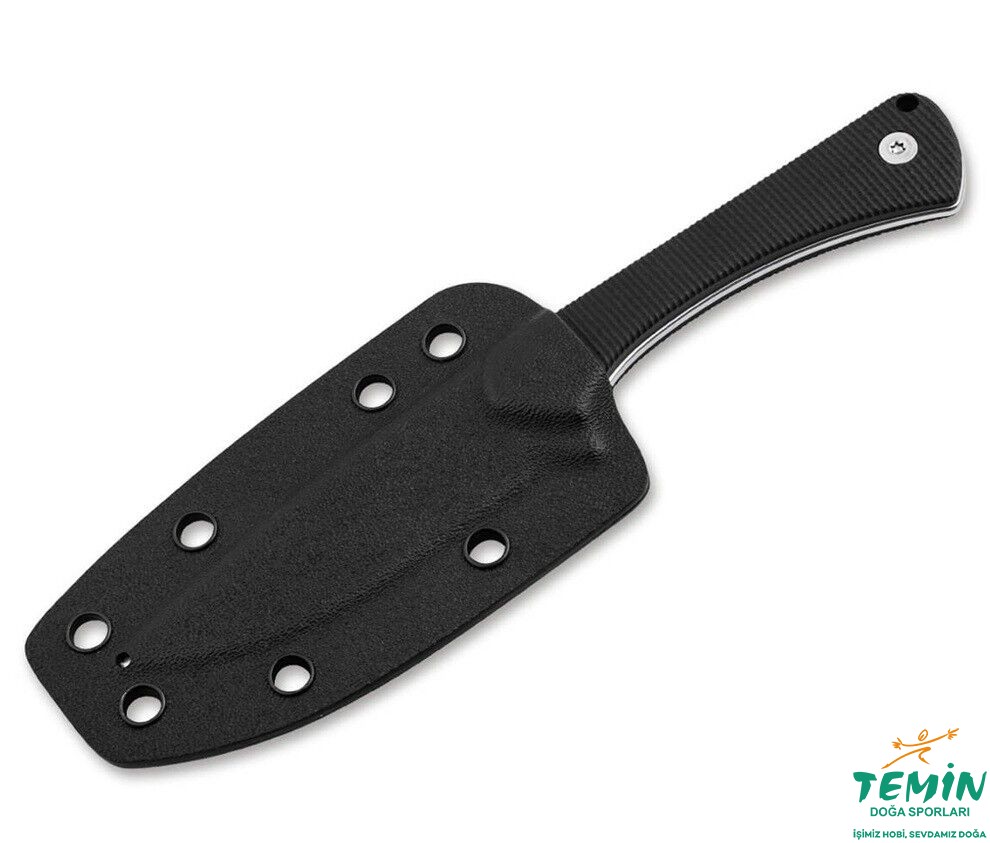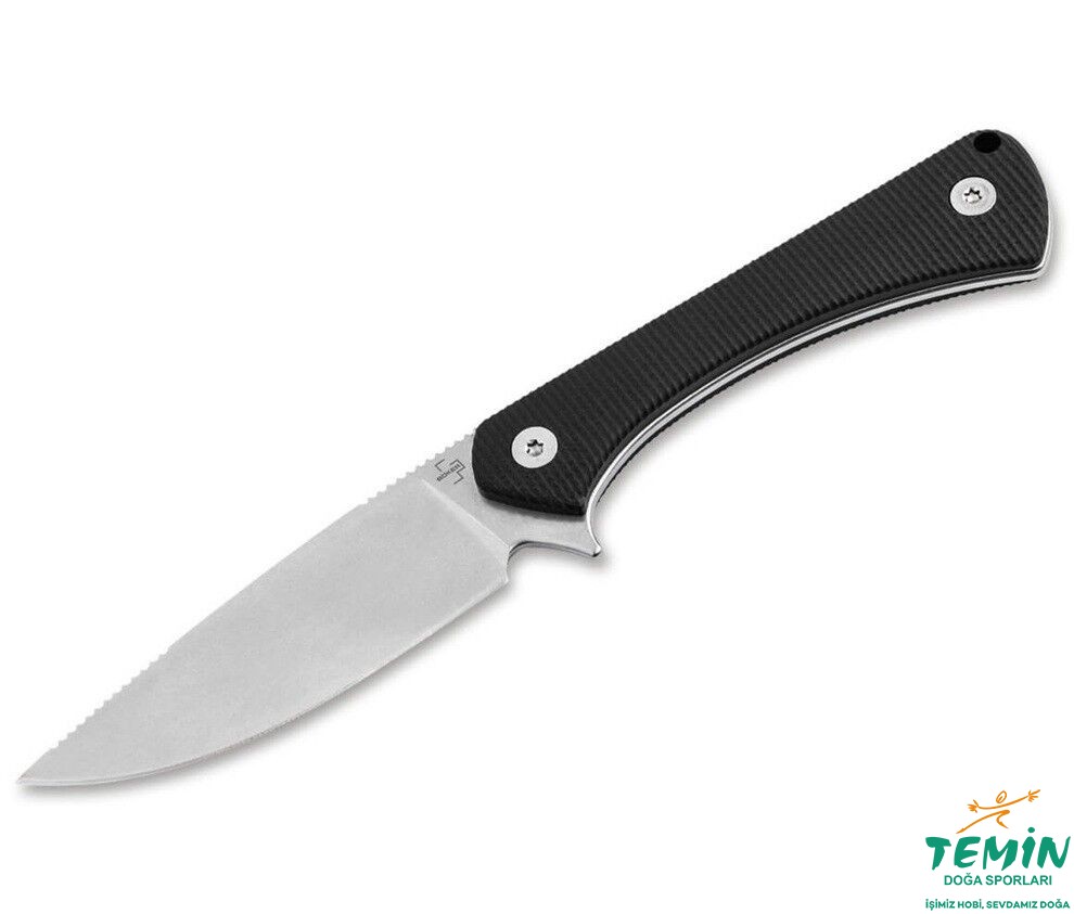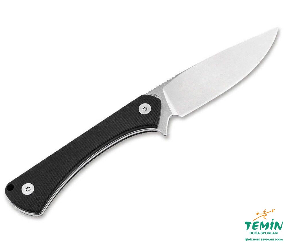 Bu bıçak, sabit bıçağa sert karakterini veren ince taş yıkama kaplaması ve sağlam full tang yapısı ile öne çıkar. Bıçağın arkasında ve ucuna yakın kısımdaki tırtıllar, güçlü ve yüksek hassasiyetli kesimler sağlarken, uzunlamasına dokulu G10'dan yapılmış hafif ve kavisli sap ve parmak koruyucu, her uygulamada olağanüstü tutuş ve güvenlik sağlar.