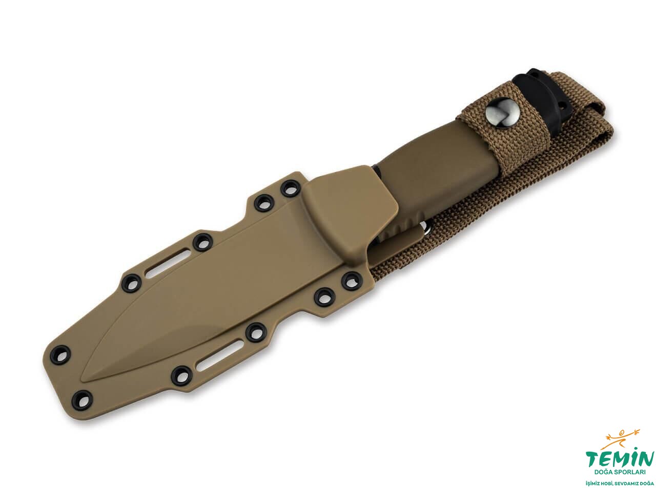 Bu tam gelişmiş dış mekân bıçağı, çıktığından bu yana oldukça beğenilen Böker Plus Outdoorsman XL’yi temel alan ama renk başta olmak üzere kimi farklı özellikler taşıyan versiyondur. Zaten uygun olan tarza gerek renk gerekse kılıf değişiklikleriyle, bir ordu bıçağı hâli verilmiştir. Yine 12C27 çeliğin kullanıldığı yekpare yapı korunmuştur. Ortadan (saber) ve düz (flat) ağız açımı yapılan yuvarlak uçlu (drop point) namlunun uç kısmının arkası, bıçağı mızrak uç yapısına meylettirecek şekilde, inceltilmiştir. Çeliği titanyum kaplanarak daha iyi korunan ve koyu rengiyle kamuflaj da sağlayan bıçak, uzatılmış kuyruk (extended tang) yapısındadır. Dolayısıyla sap malzemesinden azade kılınan kuyruğu vurup parçalama amaçlı kullanmak mümkündür. Söz konusu kısımda yine iki adet kordon deliği (lanyard hole) mevcuttur. Sap malzemesi olarak FRP (fiberglas takviyeli naylon) kullanılmıştır. Doğrudan kaplanan malzeme üzerinde, kavrama garantisi için, geniş bir kaydırmaz bölge (TPR) bulunmaktadır. Dolayısıyla, balçak bölgeleri siyah iken, avuç içinde kalacak kaydırmaz kısma kum-kahve bir renk verilmiştir. Çöl kamuflajına uygun bu seçim, bıçağın ismine de taşınmıştır. Böker Plus Desertman (02BO083), içine sıkı sıkıya oturduğu ve ayrıca çıtçıtla sabitlendiği balistik naylon kemer askılı plastik kılıfıyla sunulmaktadır. Kılıfın rengi, sap rengiyle uyumludur.
