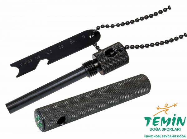 Kamp/survival için pratik ateş başlatıcı: top zincirle boyunda taşı, metal kazıyıcıyla talaş al. Pürüzlü alüminyum gövde iyi kavrar; pusula entegre. 12 cm / 100 g.