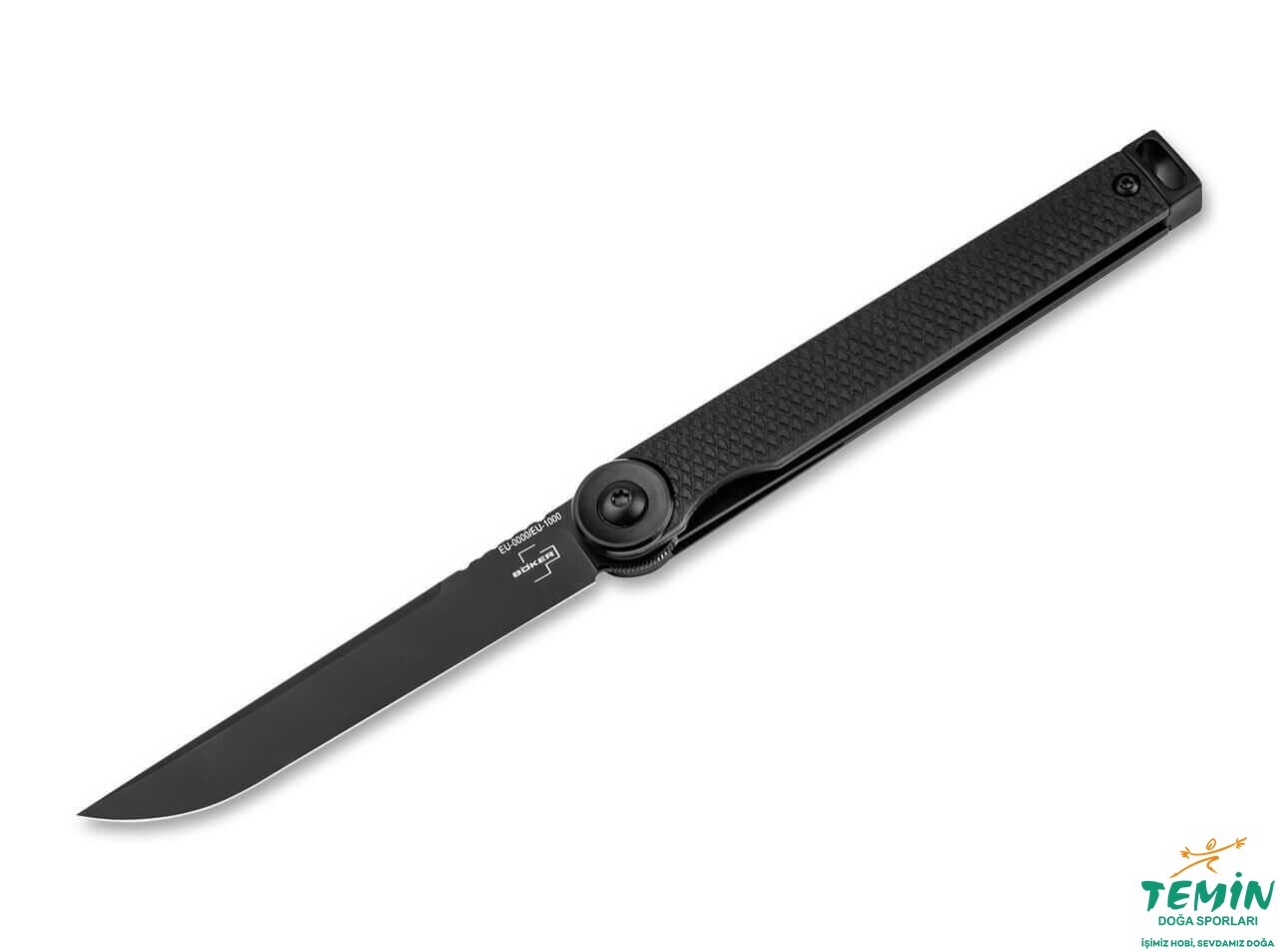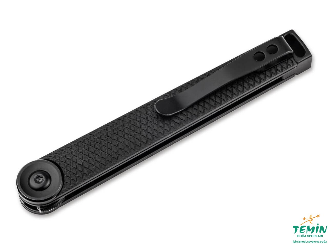 Cep klipsi (çıkarılabilir) sayesinde kolaylıkla taşınabilen Böker Plus Kaizen All Black S35VN (01BO689), zarar görmeden saklanabilmesi için, yüksek kalitede naylondan yapılan fermuarlı kesesiyle sunulmaktadır.
