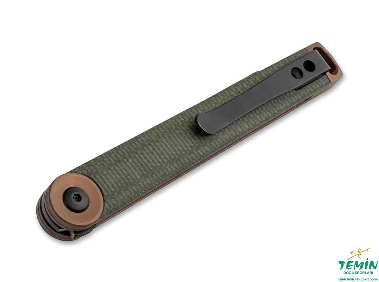 Cep klipsi (çıkarılabilir) sayesinde kolaylıkla taşınabilen Böker Plus Kaizen Green Canvas Micarta, zarar görmeden saklanabilmesi için, yüksek kalitede naylondan yapılan fermuarlı kesesiyle sunulmaktadır.