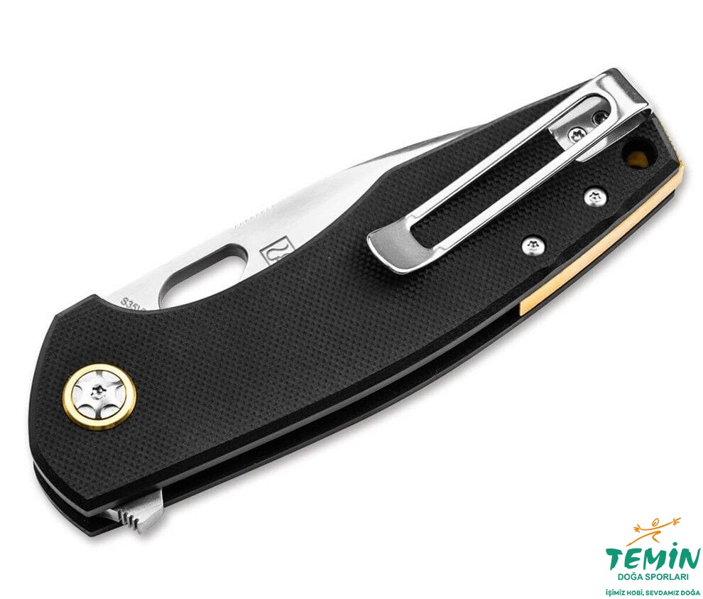 CPM-S-35VN'den üretilen, bilyalı rulmanlı Droppoint bıçak, mükemmel keskinlik ve dayanıklılık sunar. Zarif Hairline kaplama ile sırtlık ve bıçak eksen vidasındaki altın eloksal elemanlar, bıçağın yüksek kaliteli karakterini vurgular. Bıçak, isteğe bağlı olarak Flipper veya başparmak deliği ile açılabilir.