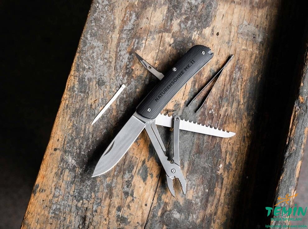 Gerrit ve Andy, kompakt çok fonksiyonlu çakı Böker Plus Naturensöhne MK. II'nin bir araya getirdiği sayısız işlevi takdir ediyor. Bu özel modelin özellikleri tam olarak iki Berlinlinin fikir ve isteklerine göre uyarlandı. Ana bıçak, ince kesme işleri için sağlam sabit bıçağın mükemmel bir tamamlayıcısıdır. İsveç Sandvik 12C27 çeliğinden yapılan bıçak, oyuk taşlama sayesinde tüm ince kesme ve oyma işlerinin yanı sıra balık ayıklamak ve benzeri işler için de uygundur. Sağlam pense, düğümleri çözerken, aynı zamanda tel bükerken, barınak ve benzerlerini inşa ederken ve gerektiğinde altıgen cıvataları ve somunlarını çevirirken de yardımcı olur. Pratik ahşap testeresi dal ve benzeri cisimleri temiz bir kesimle keser veya parçalar. Testere, çelik kalitesi ve diş konumu sayesinde boru şeklindeki kemikleri, geyik boynuzunu ve plastiği kesmek için de uygundur. Birlikte verilen dikiş/delme raybası sayesinde ahşap, kemik, geyik boynuzu ve plastikte delikler açılabilir, kabuklu budaklar delinebilir, deride delikler açılabilir ve çatlaklar ve oluklar kesilebilir veya kazınarak açılabilir. İki siyah G10 kabuğa gizlenmiş plastik bir kürdan, gerekli dış mekandan etkilenmeyecek bir şekilde hijyenini sağlar.