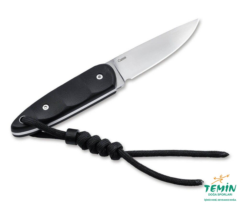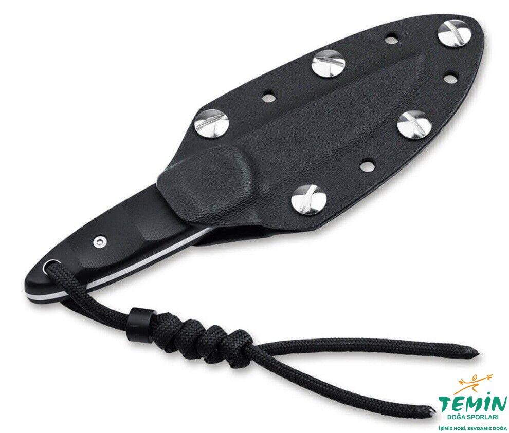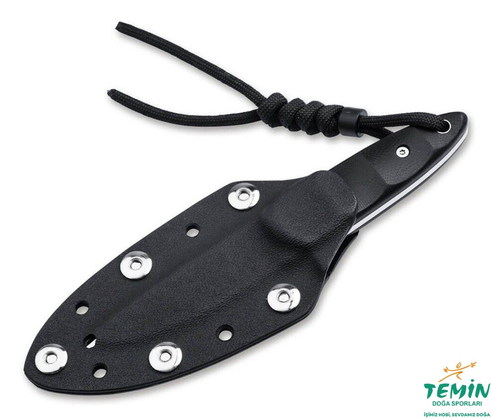Ayrıca, başparmak dayanağındaki tırtıllar ve sağlam full tang tasarımı, maksimum hassasiyet ve kontrol sağlar. Konturlu G10 sap kabzaları bu konsepti kusursuz bir şekilde tamamlar ve ergonomik parmak girintileri ile ekstra konfor sunar. Sapın ucunda, iribaşın gözlerini andıran, kordon deliği olarak kullanılabilen içi boş bir perçin bulunur. (Şık) güvenli taşıma için, top zinciri ve kordonlu özel yapım Kydex kılıf dahildir.