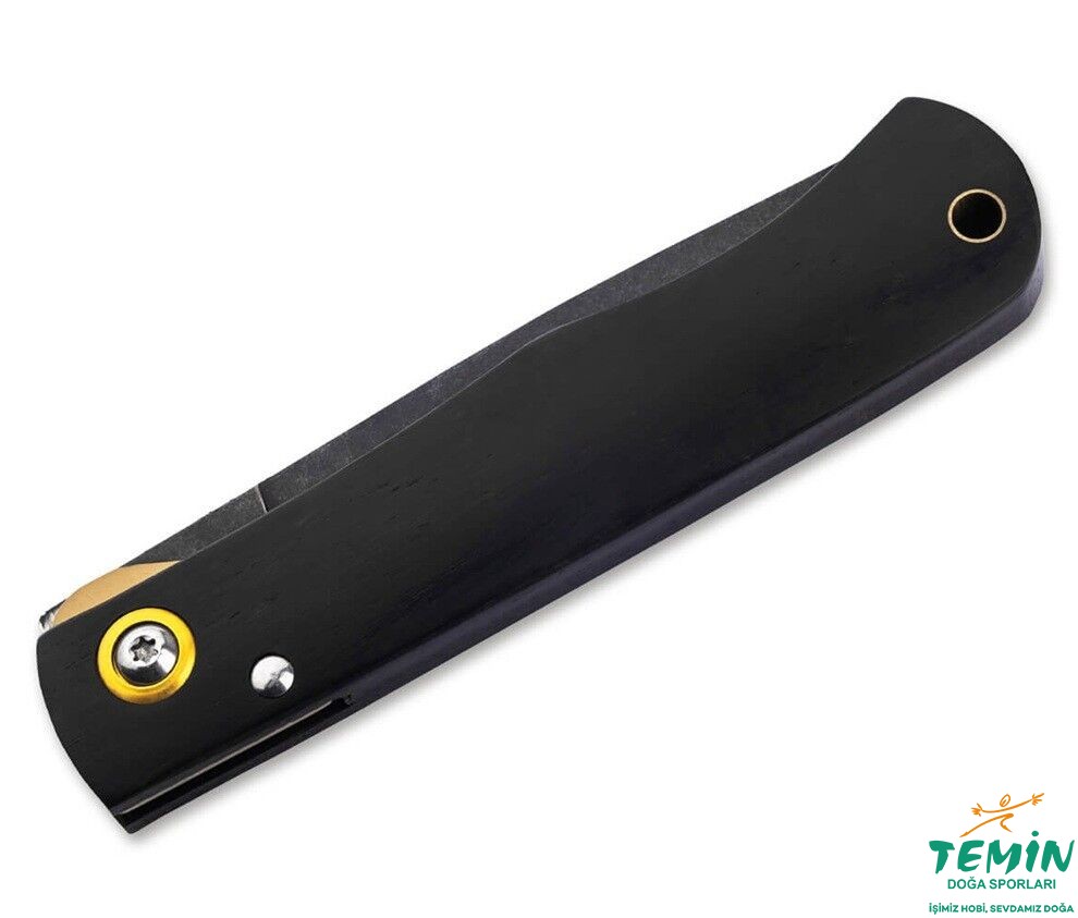Tangy siyah stonewash kaplamalı 420 clip-point çakı, klasik tırnak çentiği ile açılır ve güvenilir liner-lock ile kilitlenir. Rustik abanoz sap ve liner, bıçak pivot vidasının dış halkası ve kordon takmak için kordon deliği gibi pirinç renkli unsurlar, katlanır bıçağın düzenli görünümünü vurgular ve geleneksel bir dokunuş katar. Mütevazı bir sağlamlık ve ilk cep bıçağı olarak mükemmel bir hediye fikri.
