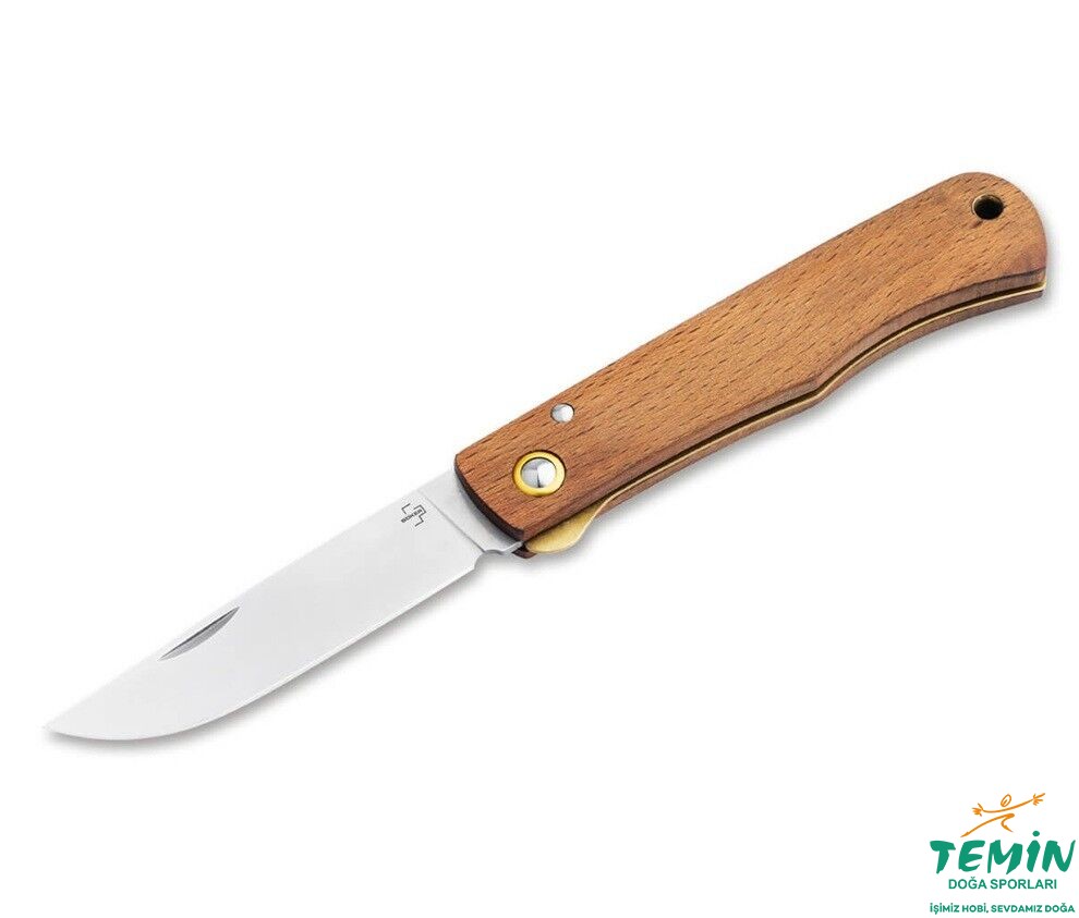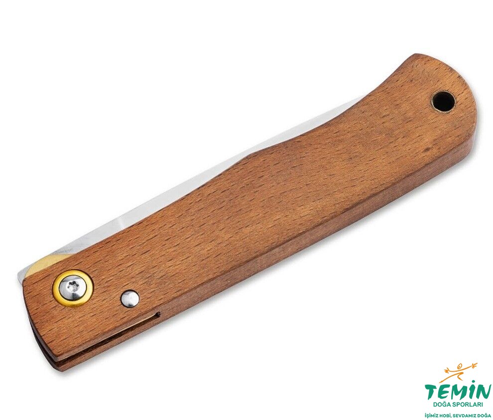 Nostaljik cep çakısı hissi: kayın sap, pirinç ip deliği ve güvenilir liner lock. 84 mm saten 420 bıçak; günlük EDC/hediye için ideal.