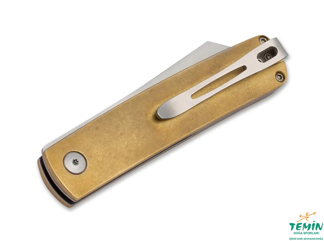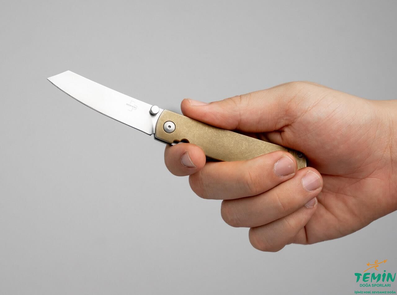 Yandan kilitli (linerlock) çakının sap malzemesi, geleneksel Japon çakılarında sıklıkla karşılaşılan pirinçtir. Üzerinde, zamanla emsalsiz bir patina oluşacak bu malzeme, paslanmaz çelik astarlar üzerine giydirilmiştir. Sap kısmın dibine doğru kullanılan enine oluk hem estetiktir hem de çakının elden kaçmamasına yardımcıdır. Çakı parçalarının bir araya getirilmesinde cıvatalardan faydalanılmıştır.