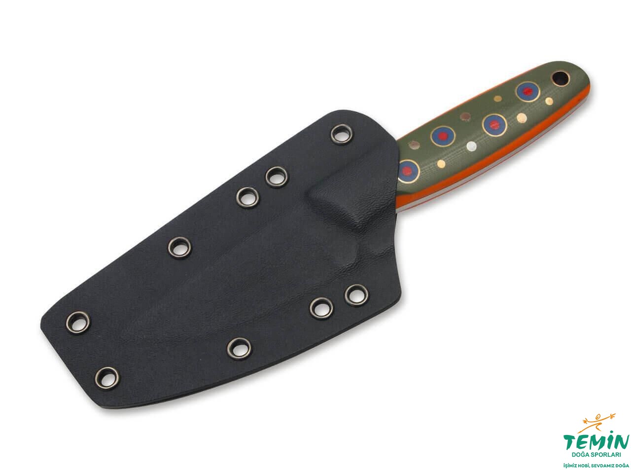 Sapın dip kısmına doğru, boru pim kullanılarak oluşturulmuş, sağlam bir kordon deliği (lanyard hole) de bulunan The Brook; içine tam oturduğu kydex kılıfı ve kemer askı aparatı ile sunulmaktadır.