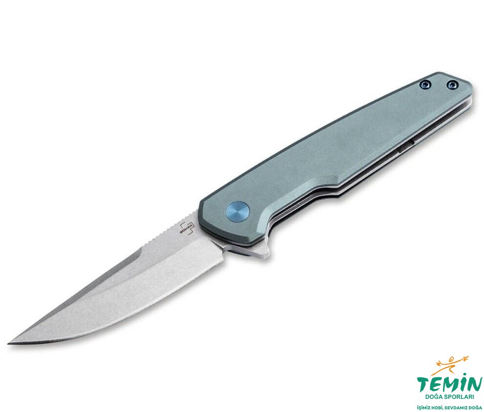 Tip-up klips (r), düz bıçak pivot vidası ve sap vidaları, mavi eloksal elemanlar, cep bıçağına özel bir dokunuş katar. Sert taş yıkama kaplaması ve kaymaz jimpingler ve dekoratif ricasso ile bıçak sırtı, görünümü ve performansı tamamlar.
