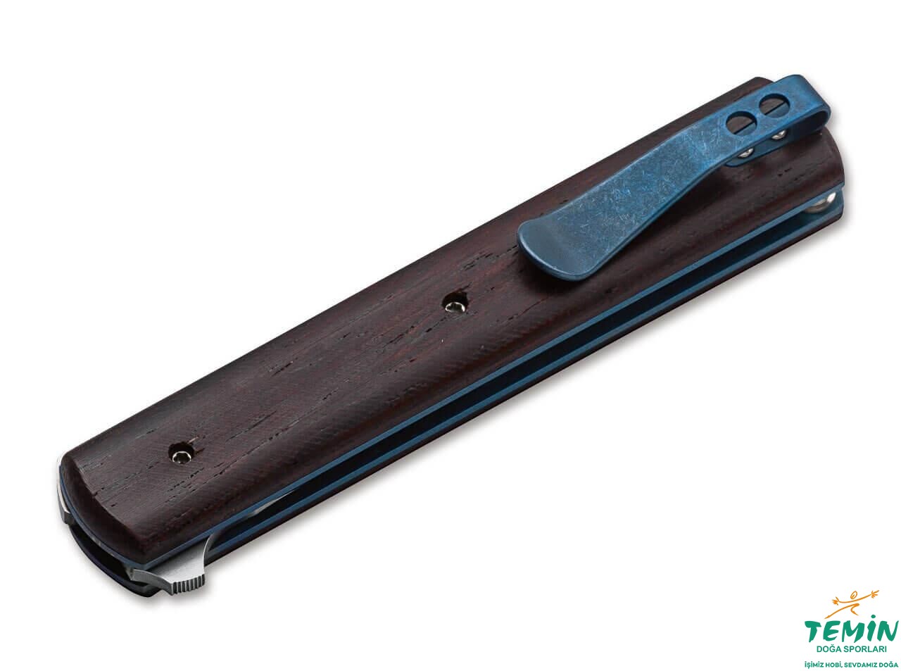 İçbükey ağız açımının (hollow grind) uygulandığı namlu, bilyeli rulman kullanılmasıyla pürüzsüz açılmaktadır. Kilit sisteminin daha da geliştirildiği çakıda hem astarlar hem çakıyı derin pozisyonda sabitleyen ve çıkarılabilir cep klipsi hem de ara parça, anodize edilerek mavi renk alan titanyumdan imal edilmiştir. Cocobolo sap malzemesi eklenmesiyle yandan kilitli (linerlock) hâle gelen çakı, öncüsüne nazaran daha dolgun bir kavrama hissi sunmaktadır. İnce damarlı ve koyu renk cocobolo ahşabının seçilerek mavi renkteki titanyum astarlar üzerine takılması, bu beyefendi çakısının asil karakterinin altını çizen bir unsur olmuştur. Sap malzemesinin yerine takılmasında cıvatalardan faydalanılmıştır.