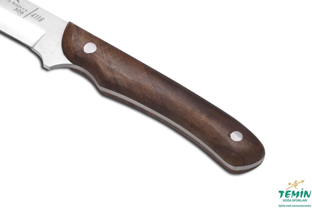 Sap malzemesinin yerine takılmasında alüminyum pimlerden faydalanılan bıçağımız, 1. sınıf, kahverengi deri kılıfı ile gönderilmektedir.