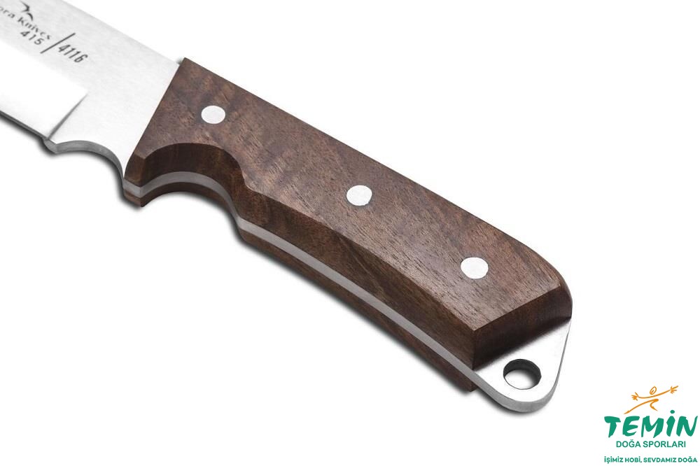 Sap malzemesinin yerine takılmasında alüminyum pimlerden faydalanılan bıçakta, uç noktası ve ahşap bitiminin aynı hat üzerinde yer almasıyla, denge ve estetik artırılmıştır.