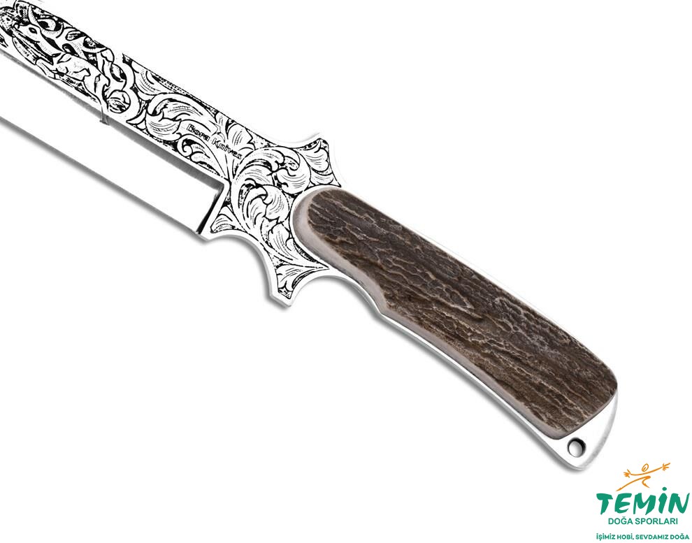 Bıçağın sap malzemesi olarak ''Geyik Boynuzu'' kullanılmıştır. Her sene üreme döneminden sonra geyiklerin boynuzları düşer ve yenisi çıkar. Orman Bakanlığımızdan sınırlı sayıda satın aldığımız geyik boynuzu, güçlü, sert ve dayanıklı yapıdadır. Doğal yapısı gereği her bıçak üzerinde farklı desen ve doku oluşturmaktadır. Bu özelliği ile son derece iyi kavrama imkânı sunan geyik boynuzu, görselliğe önem veren kullanıcılar tarafından da tercih edilmektedir.