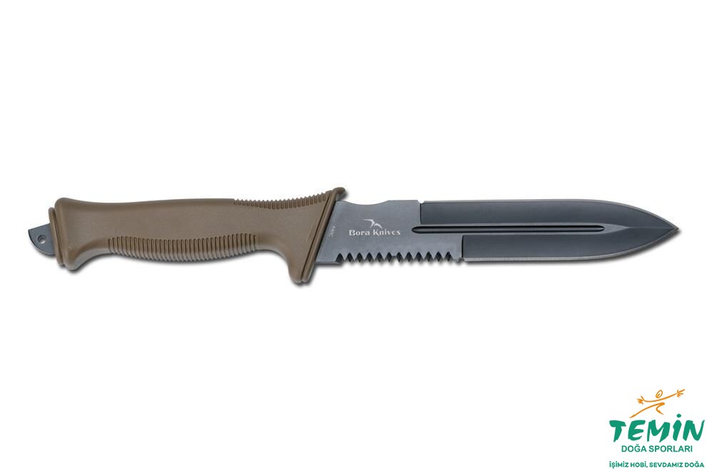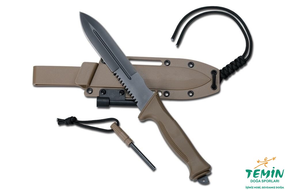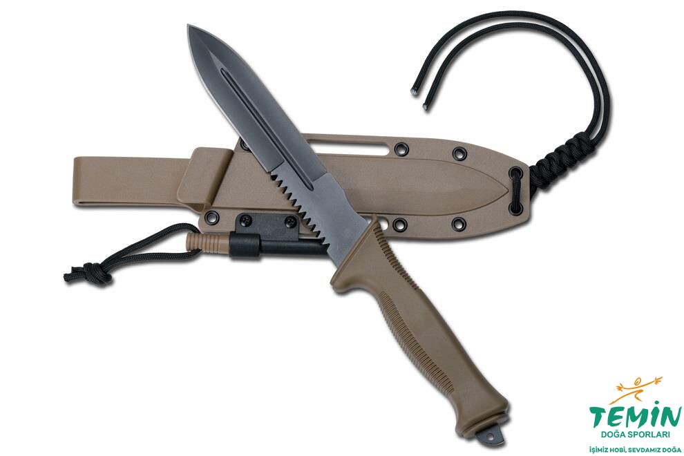 Bıçağın çeliğinde korozyona karşı direncini arttırmak için vakum iyonu ( PVD ) ile kaplanmıştır. Kılıfta ise kydex tercih edilmiştir. Bıçak kılıfa girdiğinde kilitlenmektedir. Kılıf üzerine sabitlenen ateş başlatıcı çubuk ve üzerine bağlanmış 1 metrelik siyah paracord ( 140 kg çekme kuvveti ) ile birlikte verilmektedir.