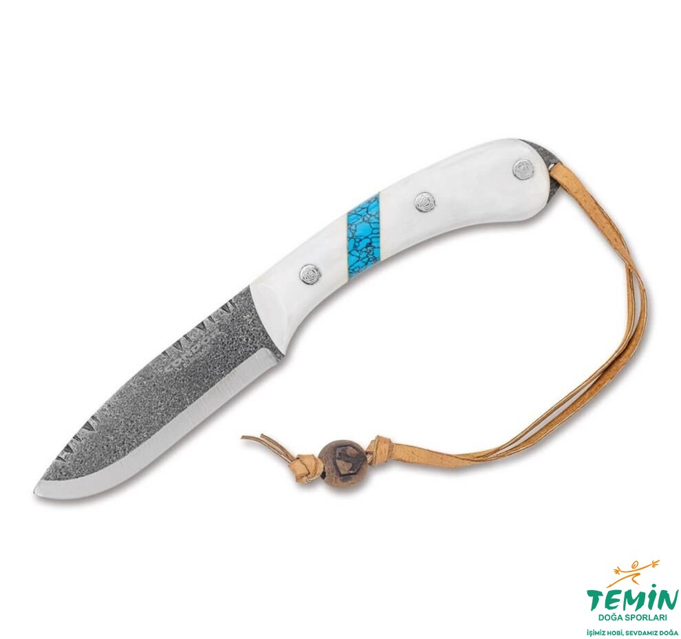 Condor'un Blue River bıçak serisi, yerli Arapaho halkının yaşadığı aynı adı taşıyan nehirden esinlenmiştir. Bu bıçak serisi, bu kabilenin savaşçı kültürünü ve olağanüstü avcılık becerilerini onurlandırmaktadır. Full tang bıçağın kusursuz tasarımı, Amerikan yerlilerinin anlamlı mücevherlerinden esinlenen turkuaz süslemeli beyaz micarta sapa sahiptir. Scandi taşlama ve iki tonlu kaplamaya sahip 1095 karbon çeliğinden yapılmış rustik drop-point ağız, bu kabilelerin atalarının geleneklerinde derin kökleri olan savaş ve avcılık ruhunu temsil eder. Av bıçağı yüksek kaliteli bir deri kılıfla birlikte verilir. Kordon deliği ve deri halkası vardır.