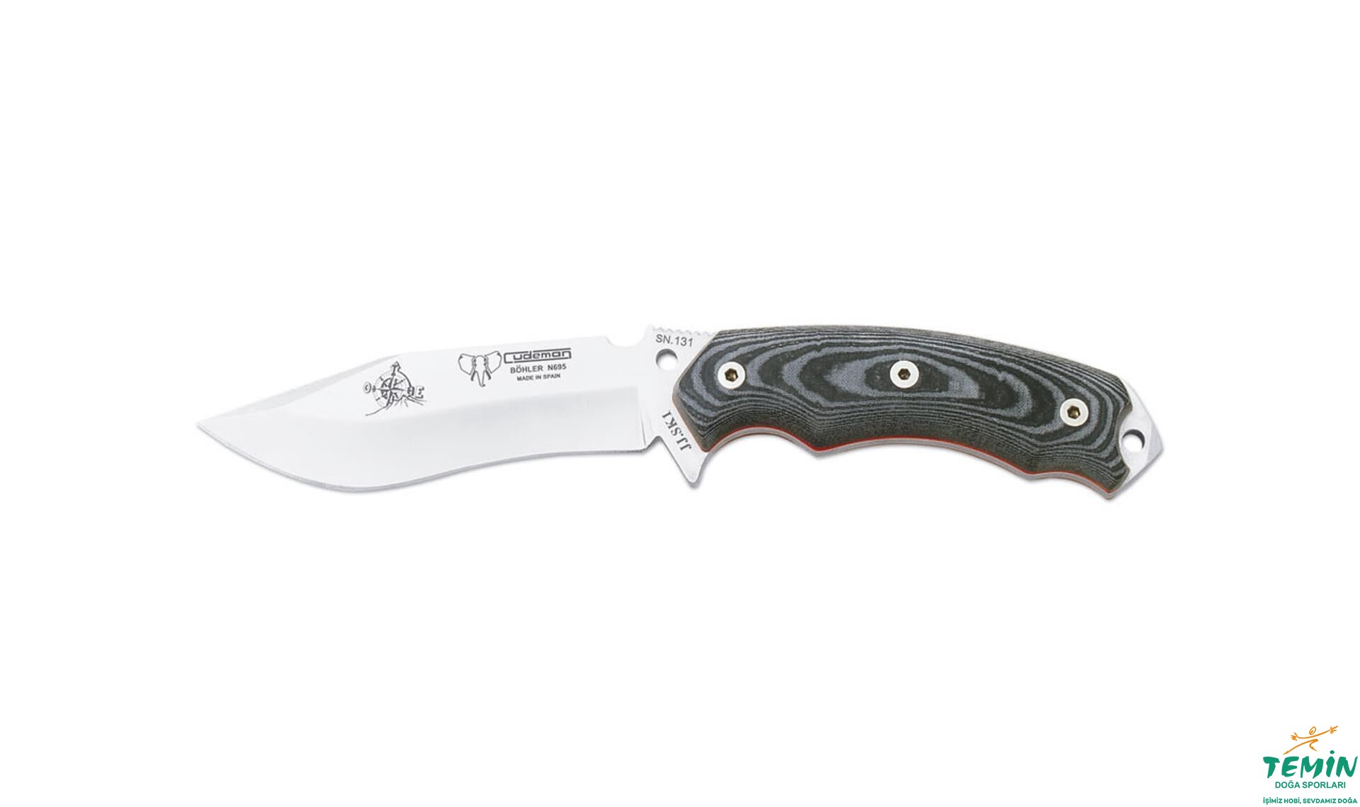 Toplam uzunluğu 24 cm olan bıçakta, 5 mm et kalınlığındaki, Böhler N695 çelik kullanılmıştır. Paslanmaz kategoride saygın bir yeri olan bu çeliğin ısıl işlem sonrası elde edilen 59-60 HRC’ye varan sertliği sayesinde birçok sert cisimleri bile rahatlıkla kesebilirsiniz. Bıçak, sivri uç (clip point) yapısındadır ve geri kıvrımlı (recurve) namlu, içbükey (hollow grind) ağız açımına sahiptir. Ağırlık dengesi; geri kıvrımlı bir bıçak olması nedeniyle, uç noktasına ve düz sırt çizgisinin de uca eğimli yapısı nedeniyle, bıçağın burnuna doğru kaymıştır. Bıçağın uç kısmının arkası, sırt çizgisine yaklaştıkça daralan tarzda, inceltilmiştir. Bütünleşik koruyucu tırnak ile, el güvenliği sağlanmıştır. Tüm bunlarla birlikte sağlam, saplanma yetisi gözetilen ve kolay savrulabilen bir yapı elde edilmiştir.