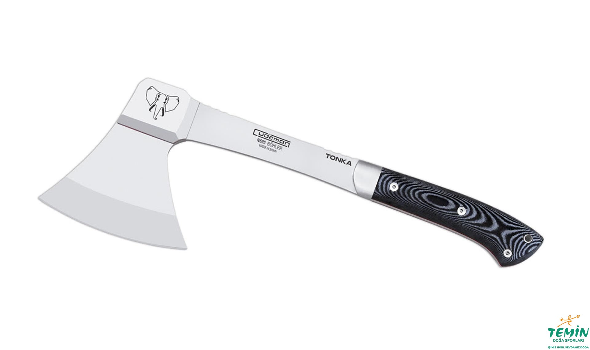 Tonka adı verilen balta, siyah renkteki deri kılıfıyla sunulmaktadır. Kılıf üzerindeki kırmızı dikişler, mikarta astarıyla uyumludur.