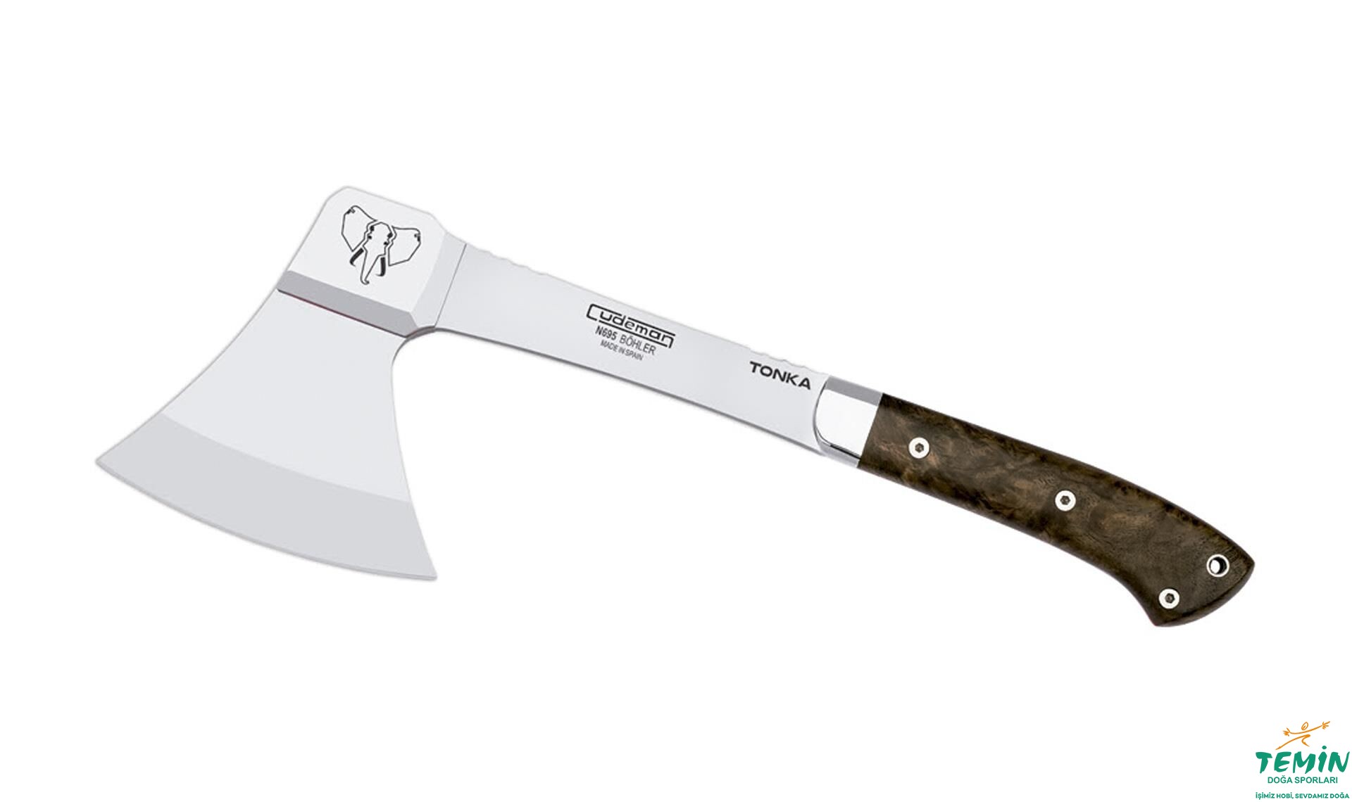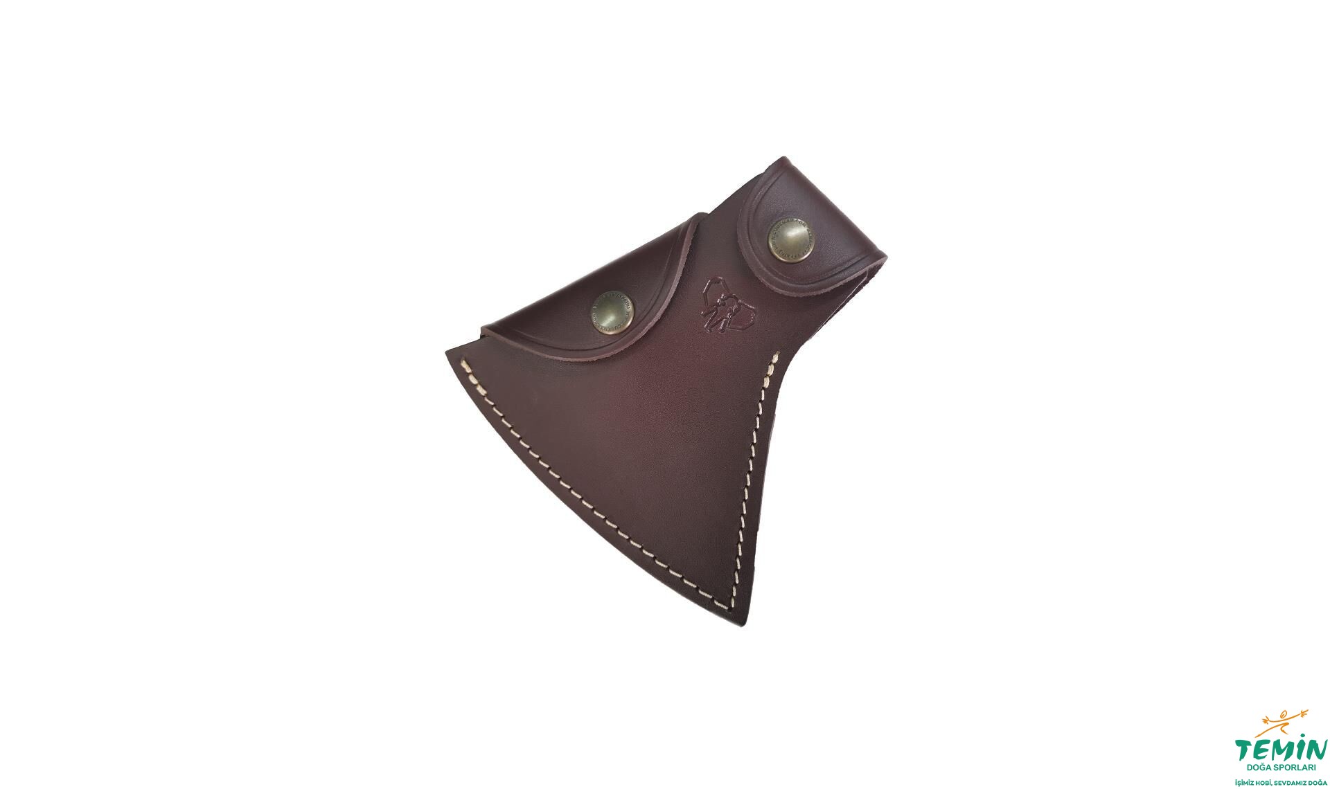 Tonka adı verilen balta, kahverengi deri kılıfıyla sunulmaktadır.