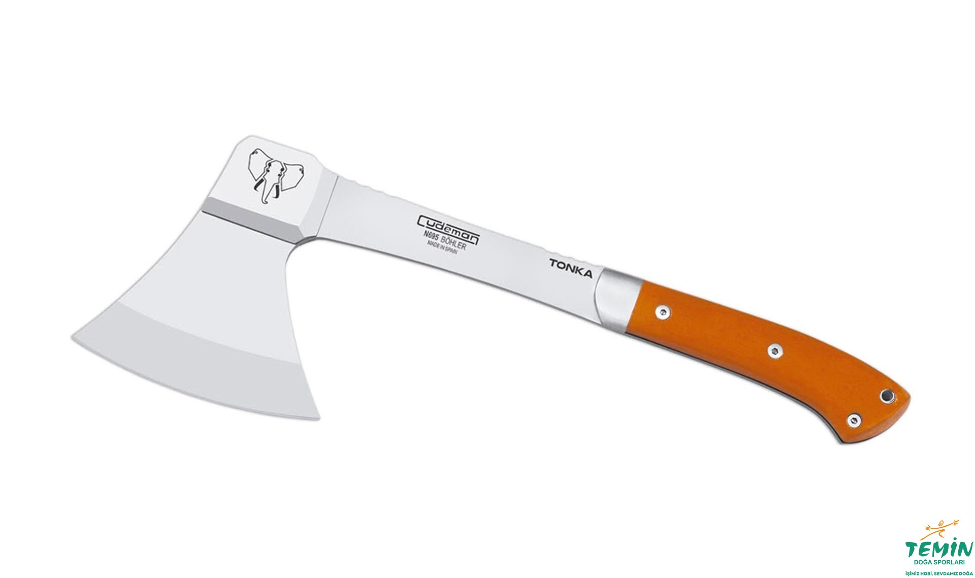 Tonka adı verilen balta, siyah deri kılıfıyla sunulmaktadır. Kılıfın üzerindeki dikişler, sap rengiyle uyumludur.