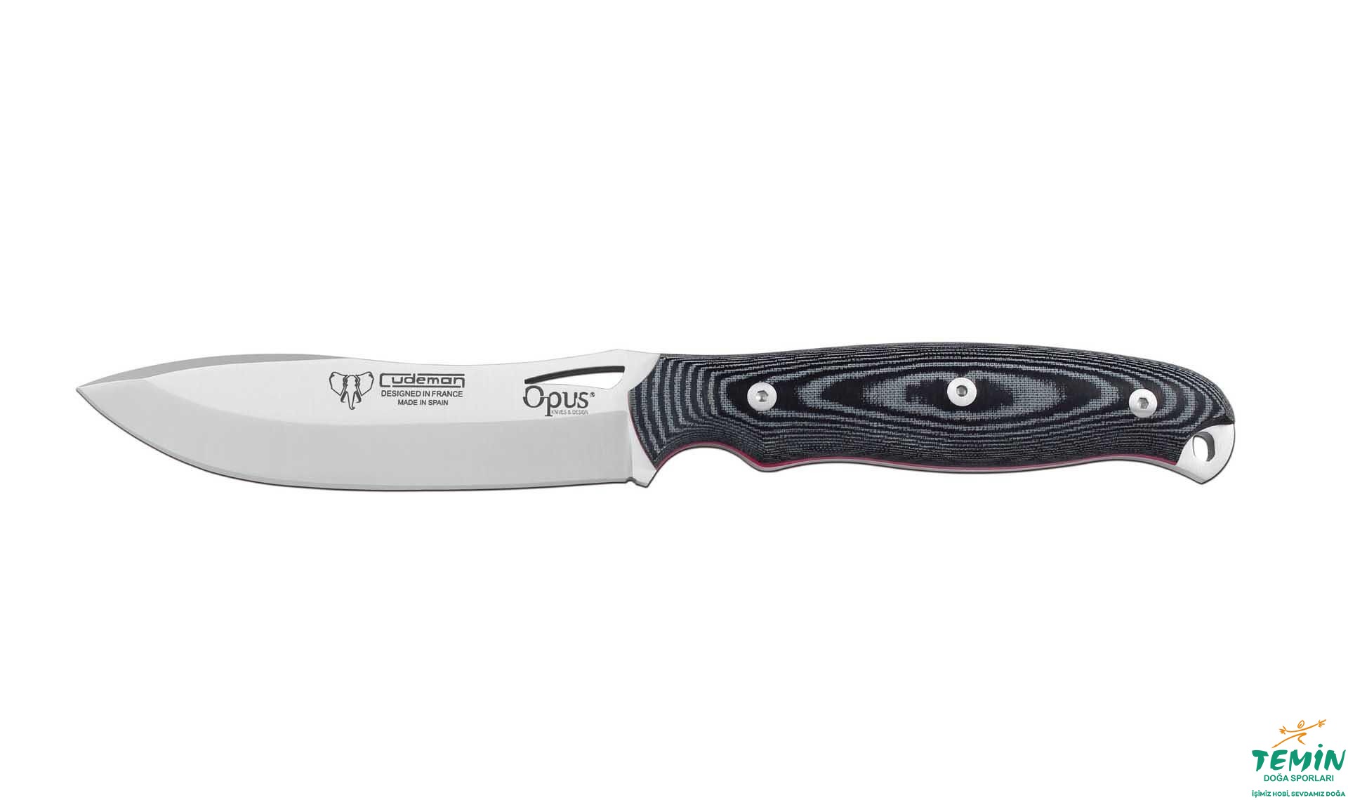 Toplam uzunluğu 22 cm olan bıçakta, 4 mm kalınlığında, Böhler N695 çelik kullanılmıştır. Paslanmaz kategoride saygın bir yeri olan bu çeliğin ısıl işlem sonrası elde edilen 59-60 HRC’ye varan sertliği sayesinde birçok sert cisimleri bile rahatlıkla kesebilirsiniz. Bıçağın ağız açımı düz (flat) biçimde yapılmıştır. Buyer’in şirketi Opus’un amblemi, bir alametifarika olarak, ricasso bölgesinde boşluk oluşturmaktadır. Bileme çizgisinin en altında bulunan minik çentik, saplayarak kesmeye başlamaya hizmet etmektedir.