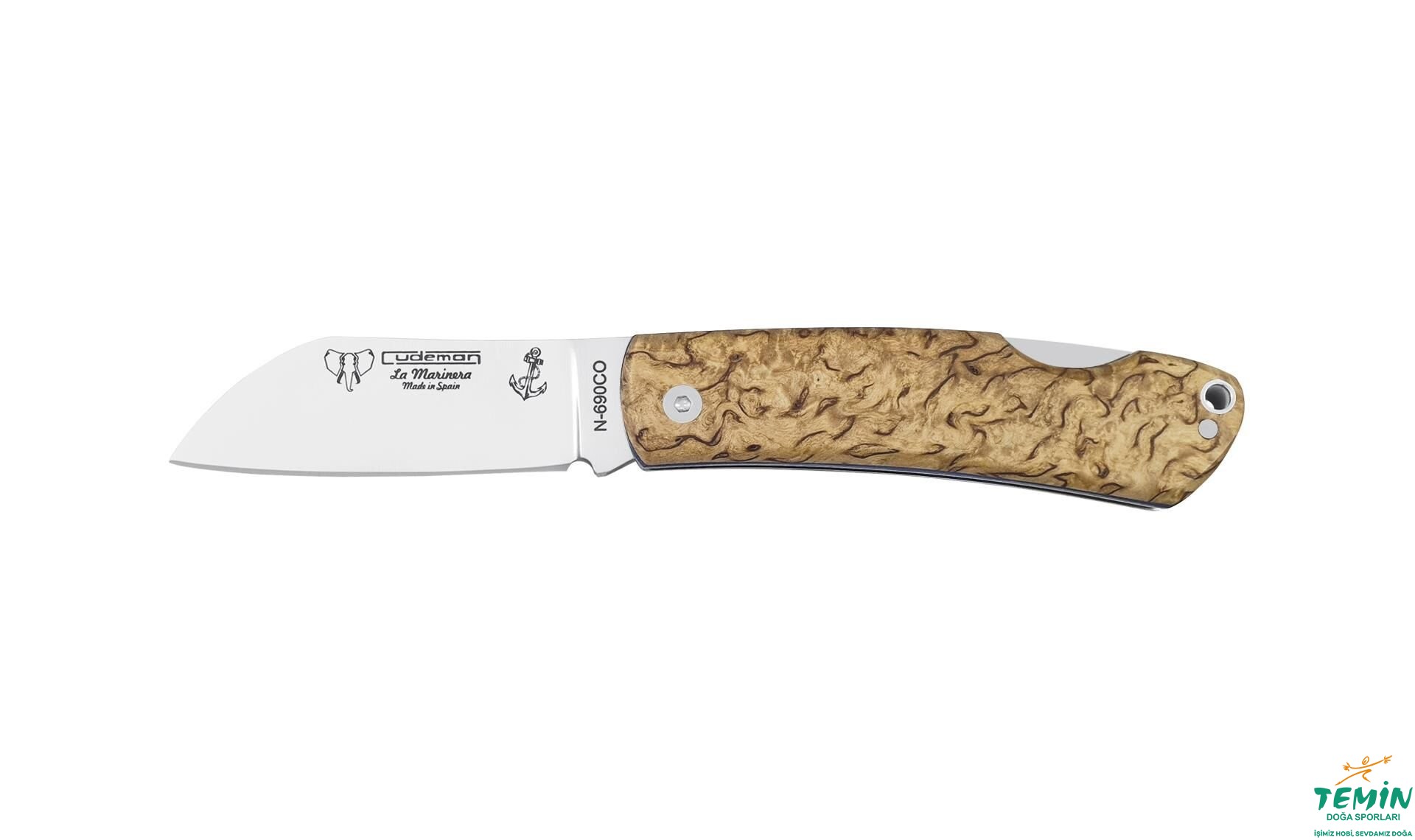 Cudeman’ın ‘‘parrot point’’ dediği uç yapısı, denizcilikte sıklıkla kullanılan Wharncliffe şeklindedir (daha fazla bilgi edinmek için https://www.boraknives.com.tr/sayfa/uc-yapisi adresinden faydalanabilirsiniz) ama keskin kenar hafif bir kavis içerdiğinden buna modifiye Wharncliffe demek yerinde olacaktır. Tam düz (full flat) ağız açımının uygulandığı namlunun çeliği, 2,8 mm kalınlığında, N690’dır. Böhler firması tarafından üretilen N690, Japon VG-10 çeliğinin geliştirilmişidir. Bu çelik, ayrı bir kategori kabul edilen toz metaller sayılmazsa, paslanmaz çeliklerin zirvesinde yer almakta ve bıçak endüstrisinin kaliteli ürünlerinde son derece yaygın olarak kullanılmaktadır. Isıl işlem sonrası elde edilen 60-61 HRC sertliği sayesinde birçok sert cisimleri bile rahatlıkla kesebilirsiniz. Keskin kenarın en altında bulunan minik çentik, saplayarak kesmeye başlamaya hizmet etmektedir. Onun da arkasında bulunan minik tırnak, kullanım güvenliğine katkı sunmaktadır.
