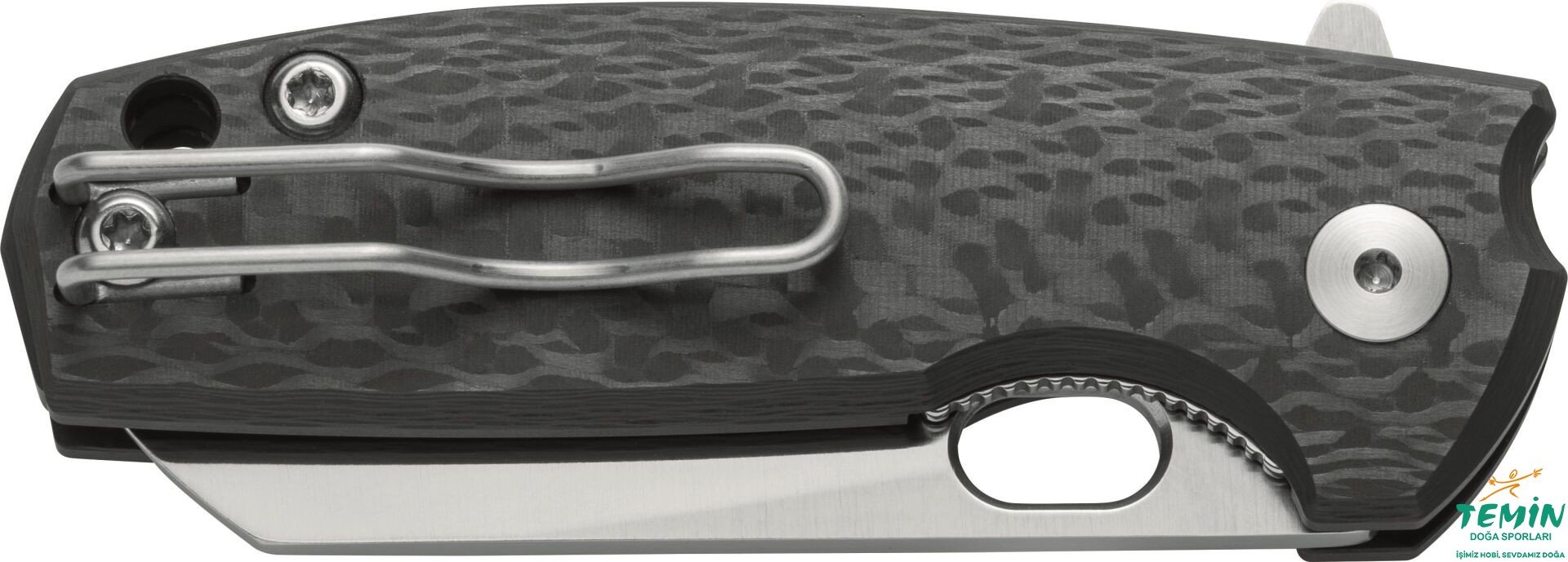 Yüksek ergonomisiyle beğeni kazanan sapta, kanatların yanında, ara parça da karbon fiber malzemeden üretilmiş ve ağırlık 80 gramda tutulmuştur. Astarlar (420) ve cıvatalar (303) paslanmaz çeliktir. Sapının dip kısmında kordon deliği de bulunan hafif, dayanıklı ve şık çakı; paslanmaz çelik telden imal edilen ve boncuk kumlamasıyla (bead blasted) matlaştırılan cep klipsi (yönü değiştirilebilir) sayesinde kolaylıkla taşınabilmektedir.
