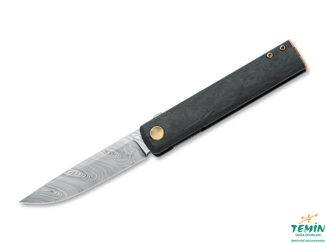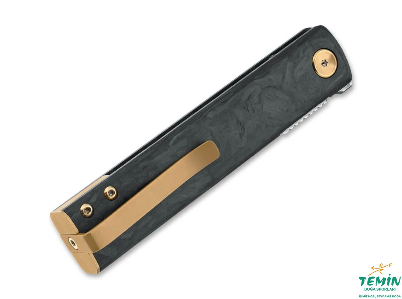 Üzerinde sıralı çentikler bulunan paslanmaz çelik (420) astarla yandan kilitli (linerlock) çakının sap malzemesi, vahşi ya da mermer denen desende karbon fiberdir. Hafif, dayanıklı ve şık bu malzeme çakıya işlevsellik ve estetik katmaktadır. Sapın diğer kanadında da içi boşaltılmış ve sap malzemesi içine gömülmüş çelik astar, sağlamlığı ve hafifliği bir kez daha vurgulamaktadır. Anodize edilerek bronz renk kazandırılan titanyumdan oluşturulan ara parça, cep klipsi ve cıvatalar; siyah karbon fiber ile hoş bir kontrast oluşturmaktadır.