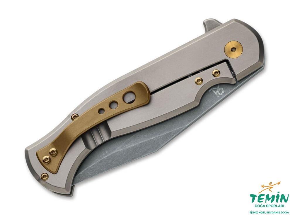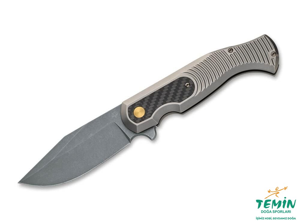 İzlediğiniz ürün, serinin seçkin bir örneğidir ve ısıl işlem sonrası 59-61 HRC sertlik kazandırılan, kaba taşlama ile matlaştırlan CPM-S-90V çelik namluya sahiptir ve keskinliğini uzun süre muhafaza edecektir. Sap malzemesi ise, anodize edilerek bronz renk kazandırılan titanyumdur Her iki titanyum sap kanadının üst yarıları içine hem hafif hem sağlam hem de şık, tek parça, karbon fiber kakılı-gömülüdür . Sap malzemesinin kuyruğa sabitlenmesinde, paslanmaz çelik cıvatalar kullanılmıştır.