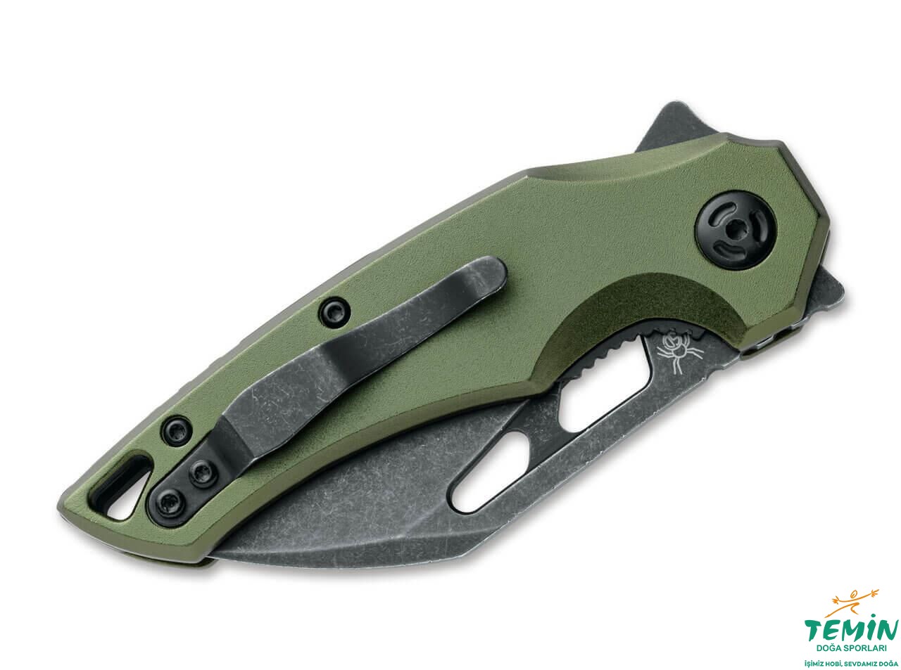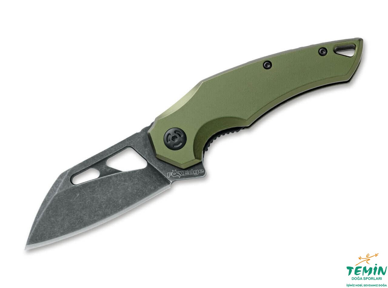 Sap dibine doğru kordon deliği (lanyard hole) de bulunan FoxEdge Atrax Aluminium OD Green (FE-026), 420J2B çelikten imal edilen ve PVD (Physical Vapor Deposition-Fiziksel Buhar Biriktirme) yöntemiyle siyah renkte kaplanan cep klipsi (çıkarılabilir) sayesinde kolaylıkla taşınabilmektedir.