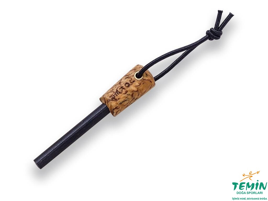 İzlediğiniz üründe, kılıfa takılabilen bir ateş başlatıcı çubuk (ferrocerium rod) ve onu sürtüp kıvılcım çıkarabileceğiniz metal plaka (striker plate) bulunmaktadır. Kordon deliğine sahip ateş başlatıcı çubuğun (PD5) başlığı, bıçağın sap malzemesiyle aynıdır.